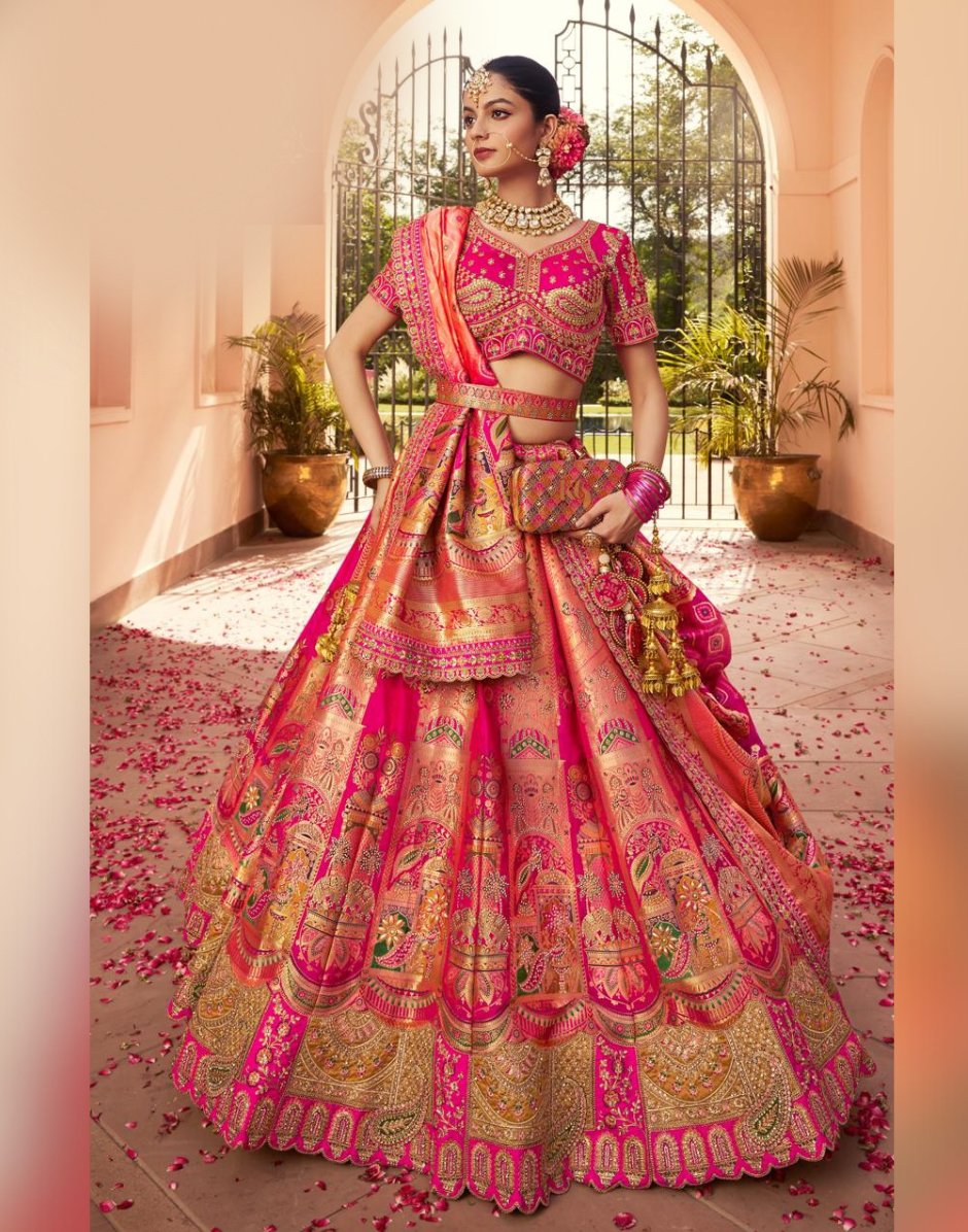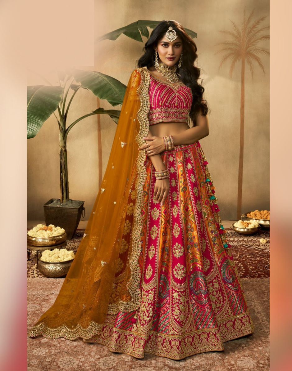 Elevate your festive wardrobe with this exquisite pink silk lehenga, perfect for weddings and special...