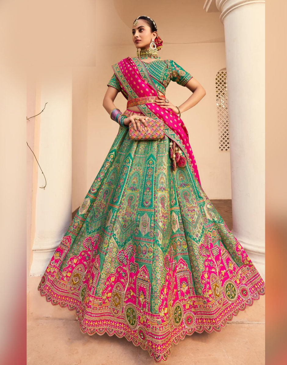 Elevate your festive wardrobe with this glamorous green silk lehenga, crafted with intricate Zarkan embroidery...