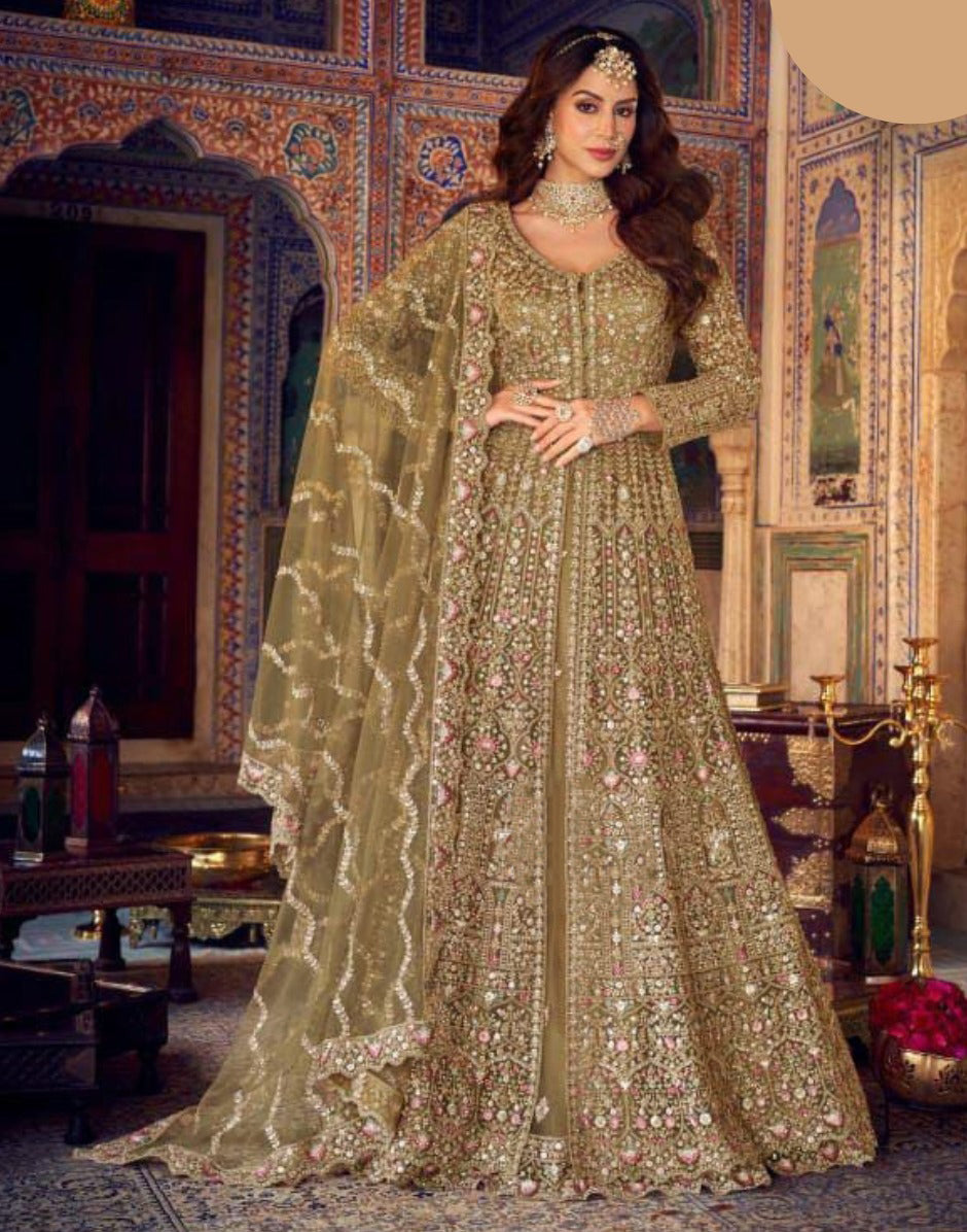 Elevate your bridal or festive wardrobe with this traditional brown lehenga paired with a richly...