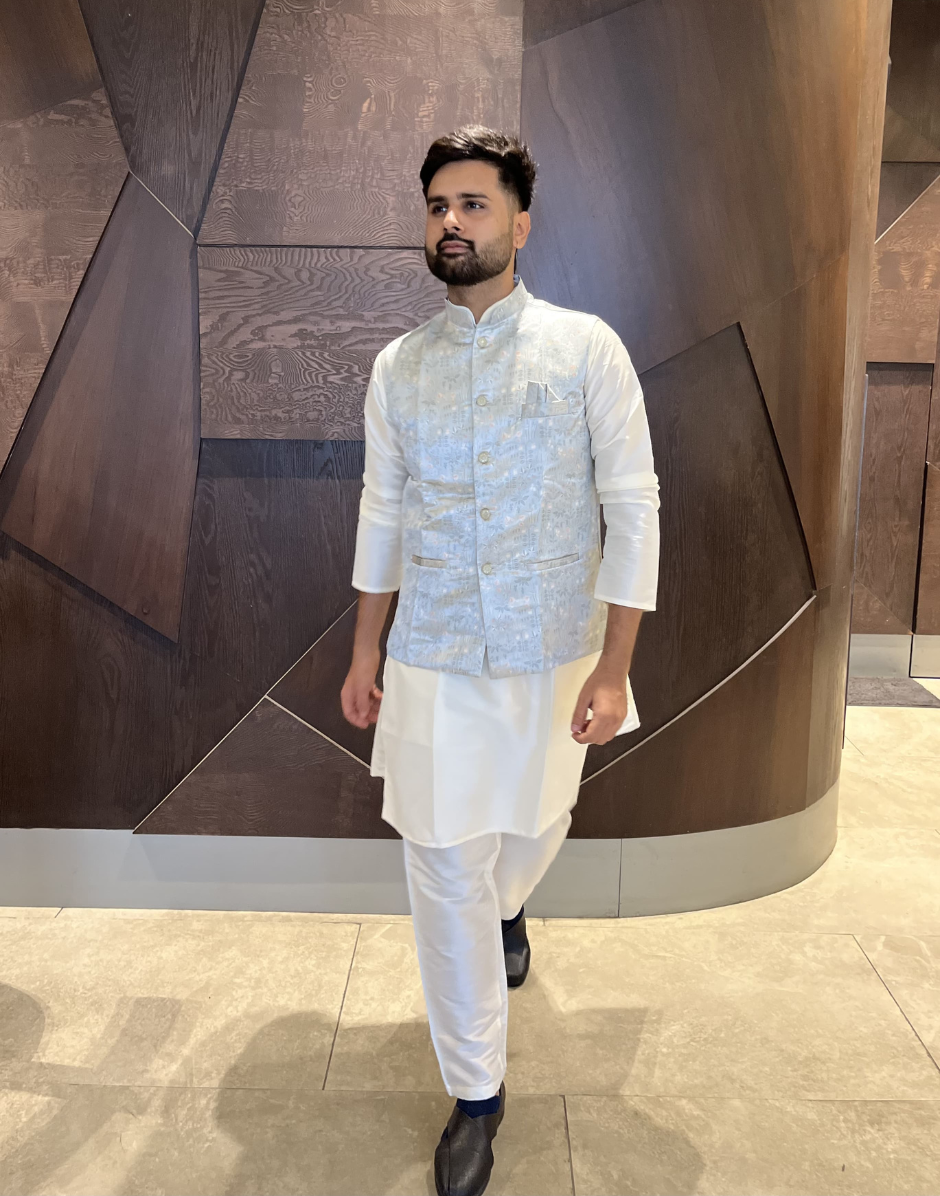 This Traditional Yet Trendy Men’s Green Floral Jacquard Silk Kurta Pant Jacket Set blends heritage...