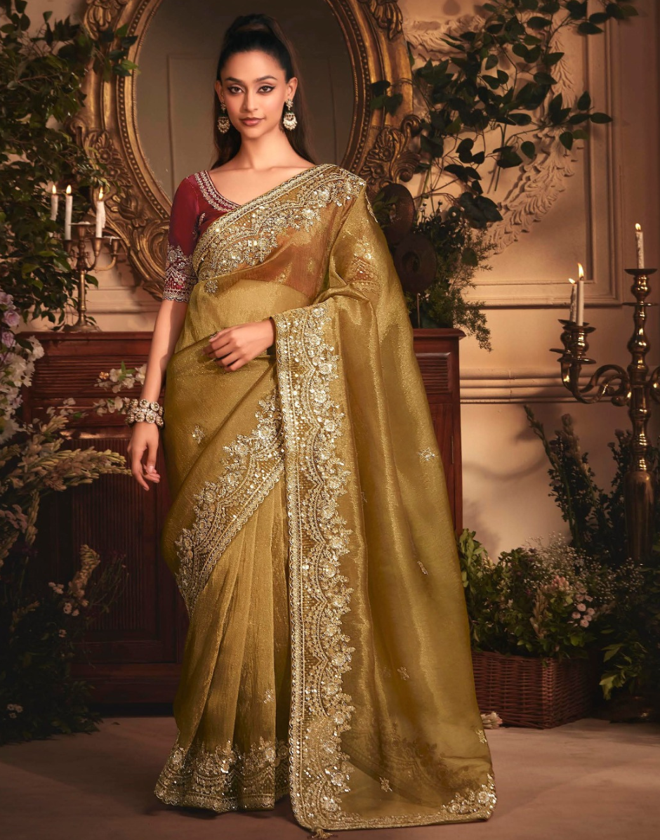 Elevate your festive and wedding wardrobe with this Mehendi Green Organza Saree, featuring an exquisite...