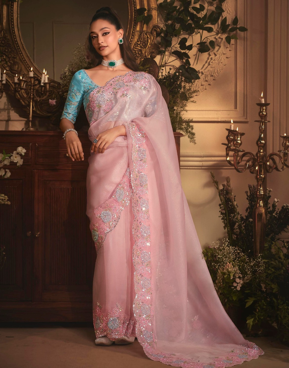 Elevate your ethnic wardrobe with this luxury blush pink organza saree, meticulously crafted with intricate...