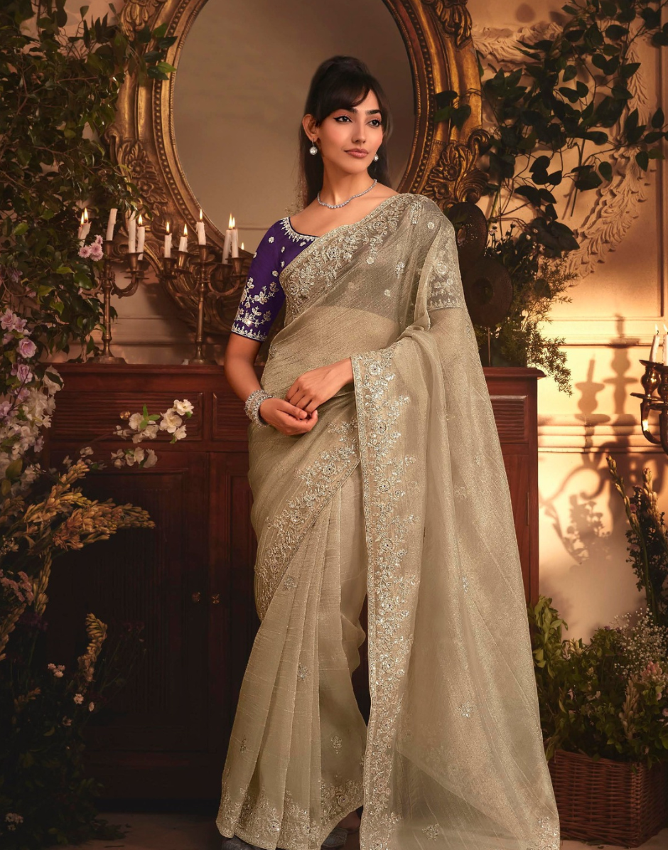 This elegant beige organza saree showcases intricate butta embroidery, blending traditional craftsmanship with refined style....