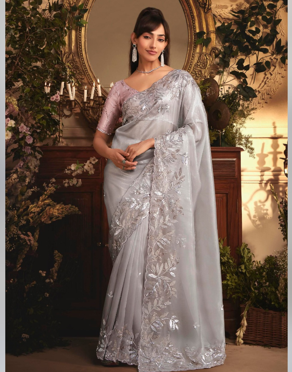 Elevate your wardrobe with this Designer Grey Organza Saree, featuring intricate all-over butta work that...