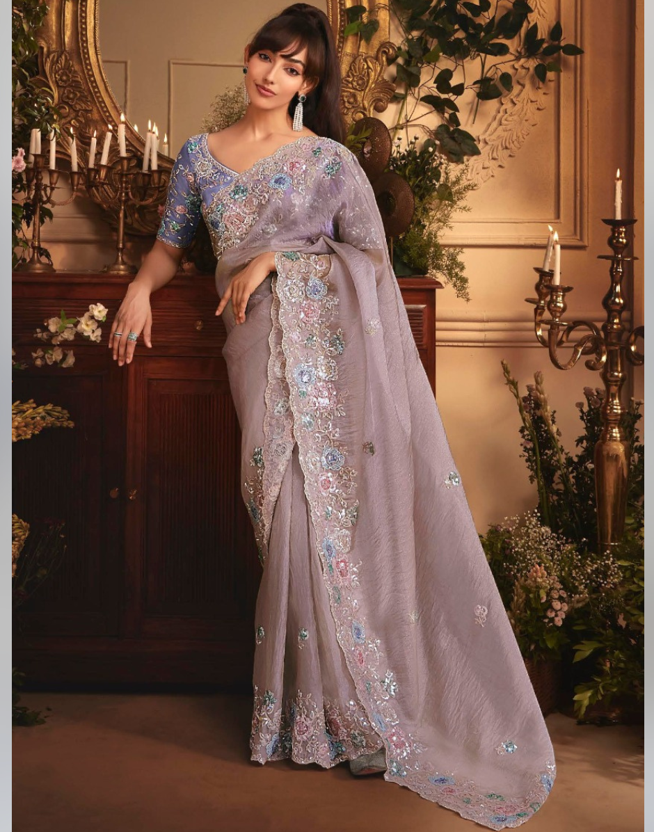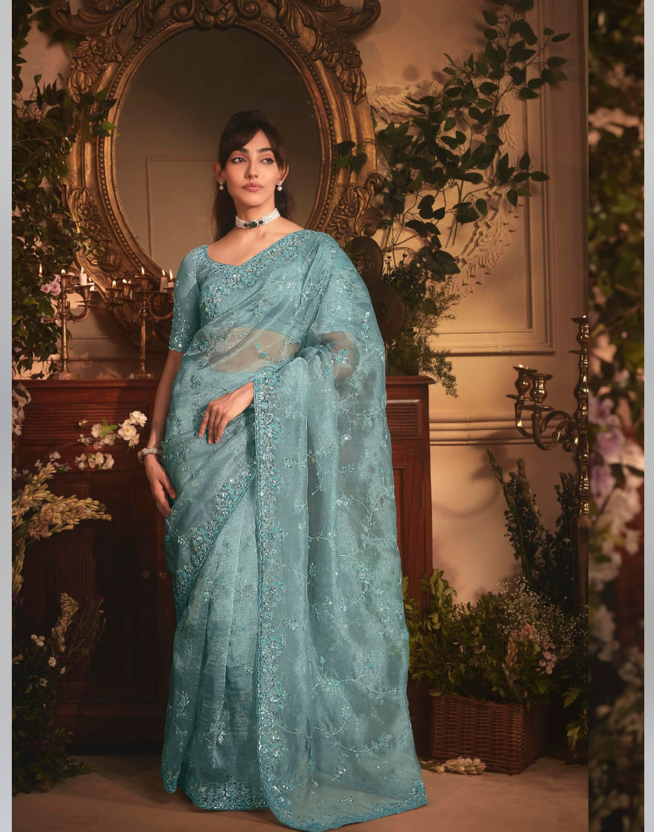 Elevate your wardrobe with this luxury sky blue organza saree, expertly crafted for a refined...