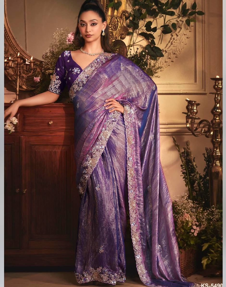 Elevate your festive and wedding wardrobe with this exquisite Purple Organza Saree. Featuring a heavy...