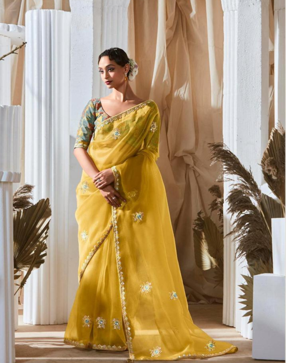 Elevate your wardrobe with this Designer Yellow Organza Saree, showcasing intricate full butta embroidery that...