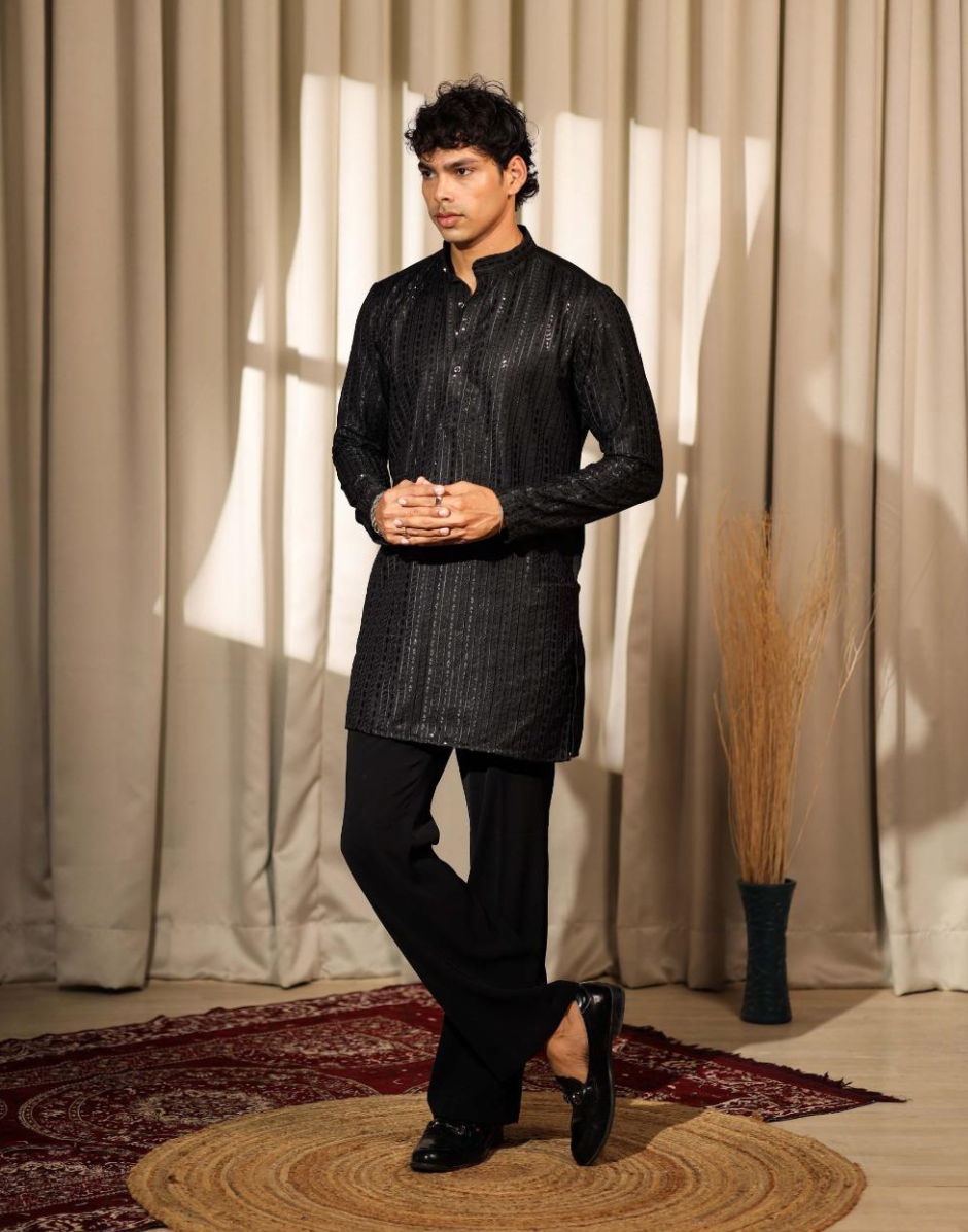 Black Silk Blend Kurta Pyjama with Sequin Detailing Trendy Festive Outfit for Men - Buy
