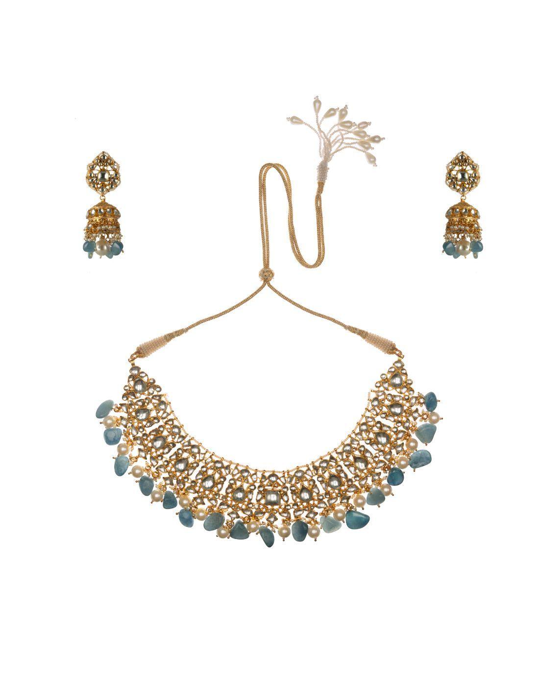 GOLD PLATED BLUE AND WHITE CHOKER NECKLACE SET-Accessories-Glamourental