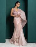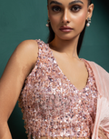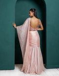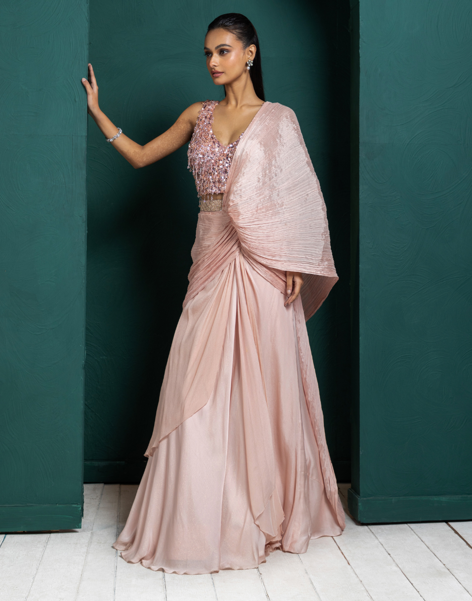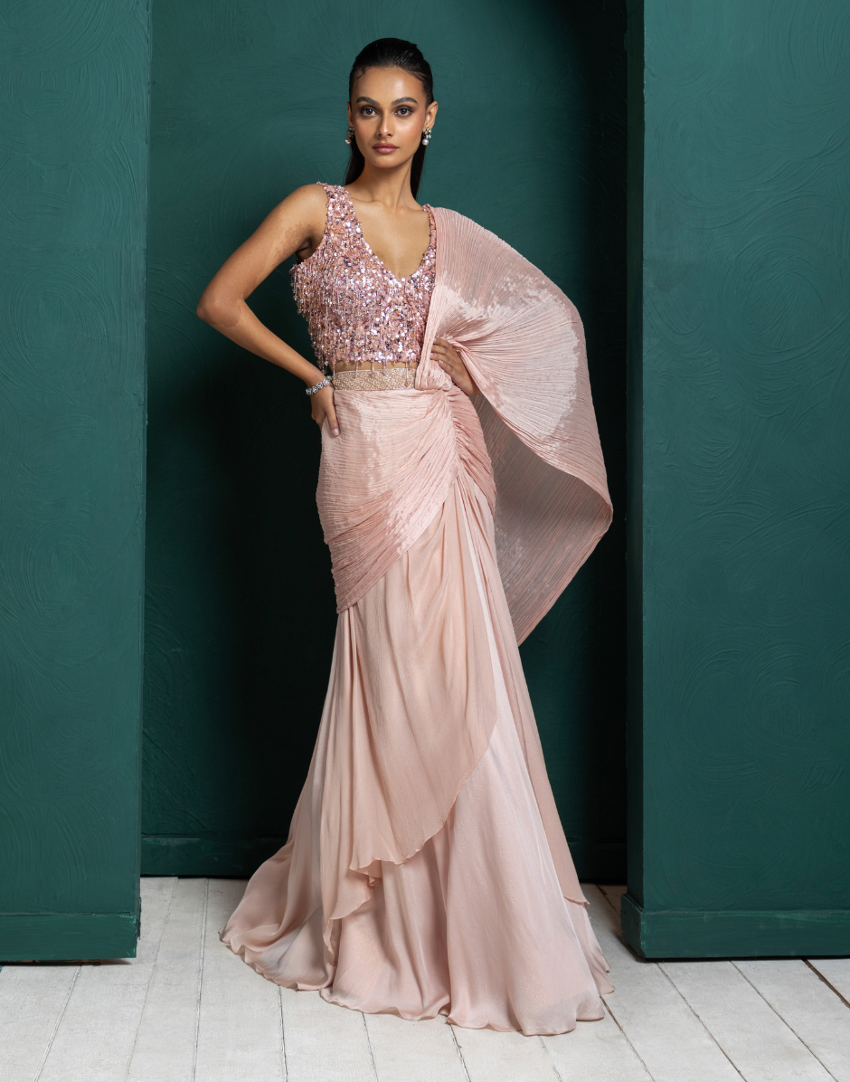 Radiate grace with the Blush Elegance Drape Set, a perfect fusion of modernity and tradition. This ensemble features a delicately embellished sleeveless blouse with shimmering sequins, exuding refined charm. The flowing blush-hued draped skirt with soft pleats and layers adds a touch of romantic sophistication. The look is completed with a matching pleated dupatta for an effortlessly chic vibe. Ideal for weddings, receptions, or festive gatherings, this outfit ensures you stand out with timeless elegance and contemporary flair.