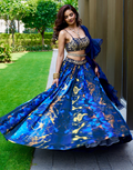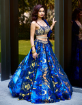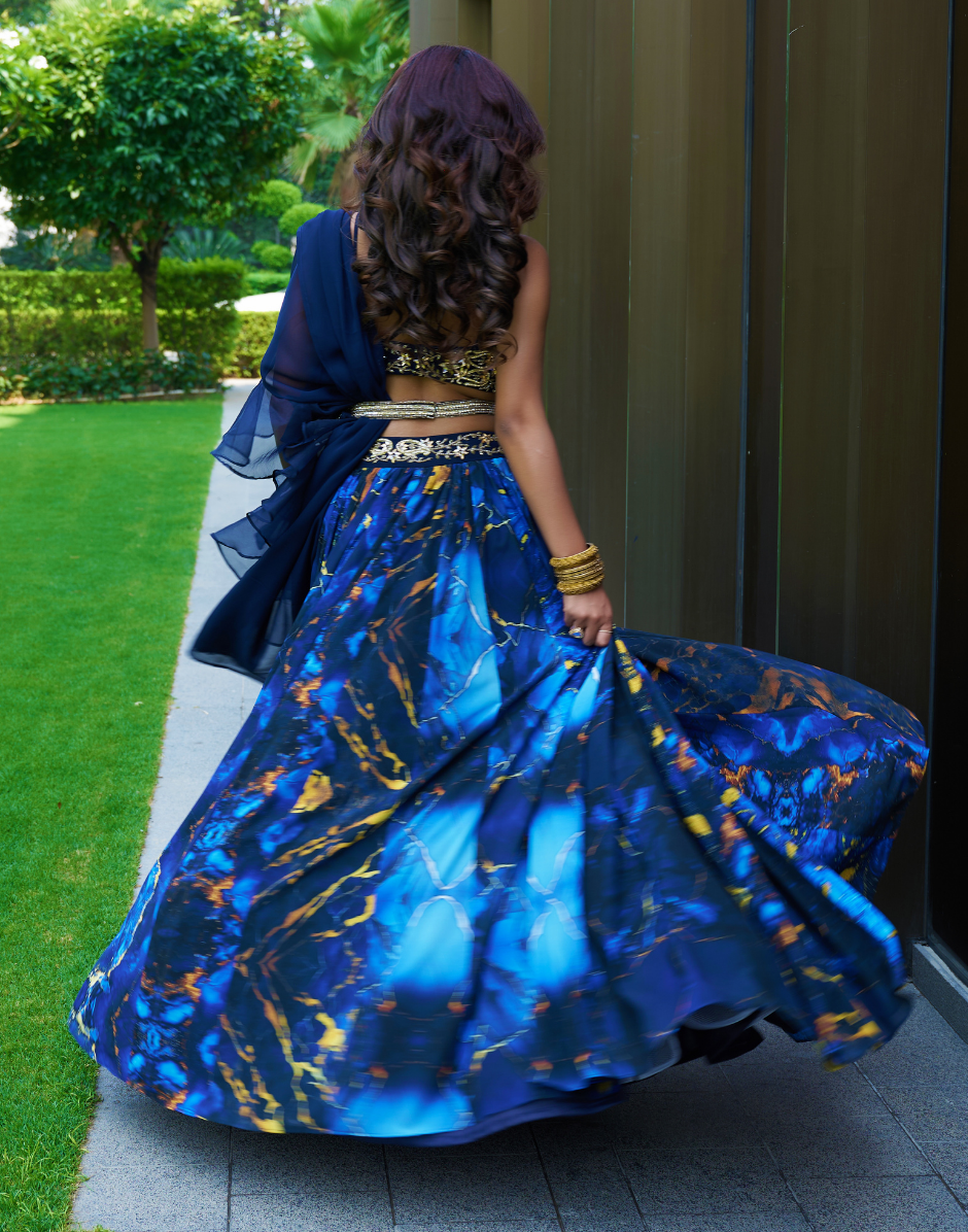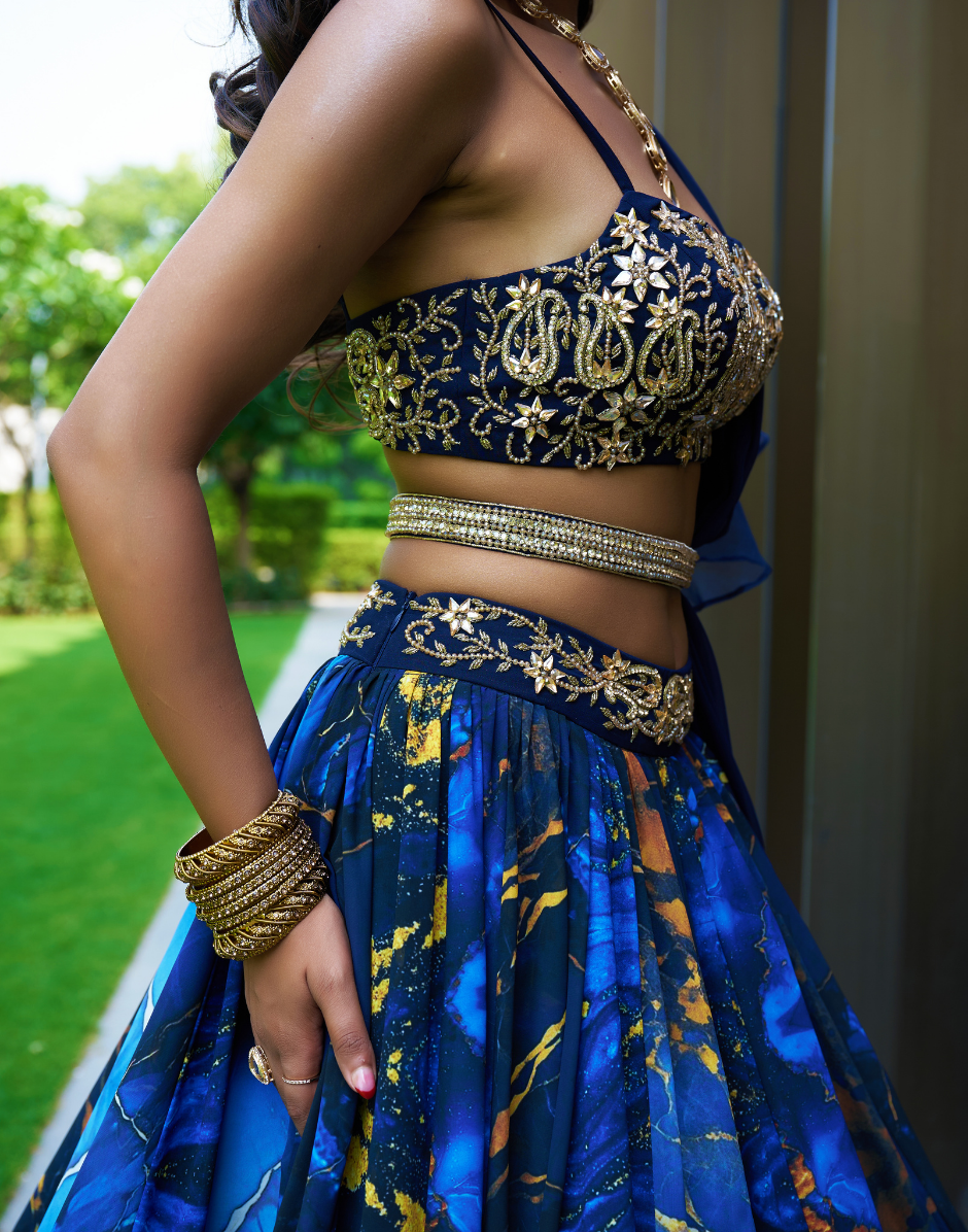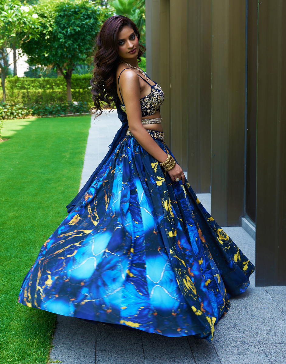 Boho Blue Marble Print Georgette Lehenga with Embroidered Bustier & Ruffled Dupatta Modern Festive Look