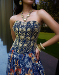 Elevate your festive ensemble with our Boho Blue Marble Print Georgette Lehenga, featuring a stunning embroidered bustier and ruffled dupatta. Designed with a modern twist, this piece is perfect for making a statement. Crafted with lightweight georgette fabric, it offers comfort and style.
