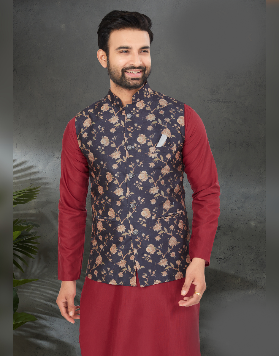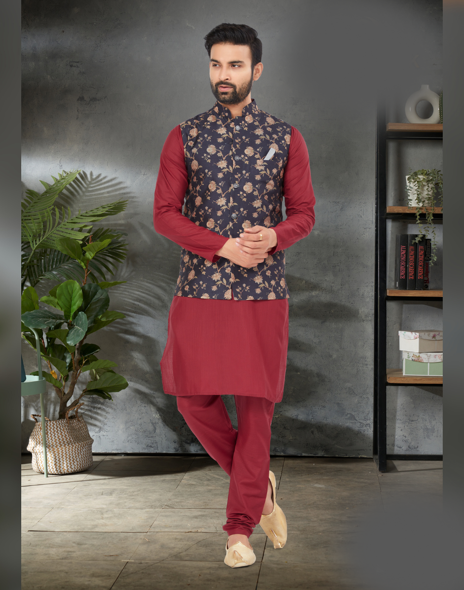 Elevate your festive wardrobe with this Bold Red Digital Printed Kurta Pajama & Jacket Set, expertly crafted for weddings and special occasions. The vibrant digital print adds a contemporary touch to traditional attire, while the coordinated jacket enhances the ensemble's sophistication. Designed for comfort and style, this set ensures you stand out with confidence at any celebration.