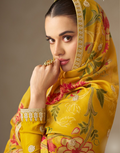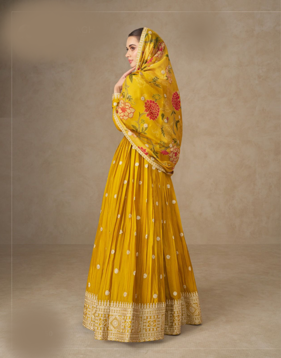 This yellow chinnon silk Anarkali outfit features intricate embroidery that enhances its sophisticated appeal. The flowing fabric provides a flattering silhouette, blending comfort with elegance. Paired with a delicately patterned floral dupatta, this ensemble is ideal for special occasions where refined style and traditional craftsmanship are desired.