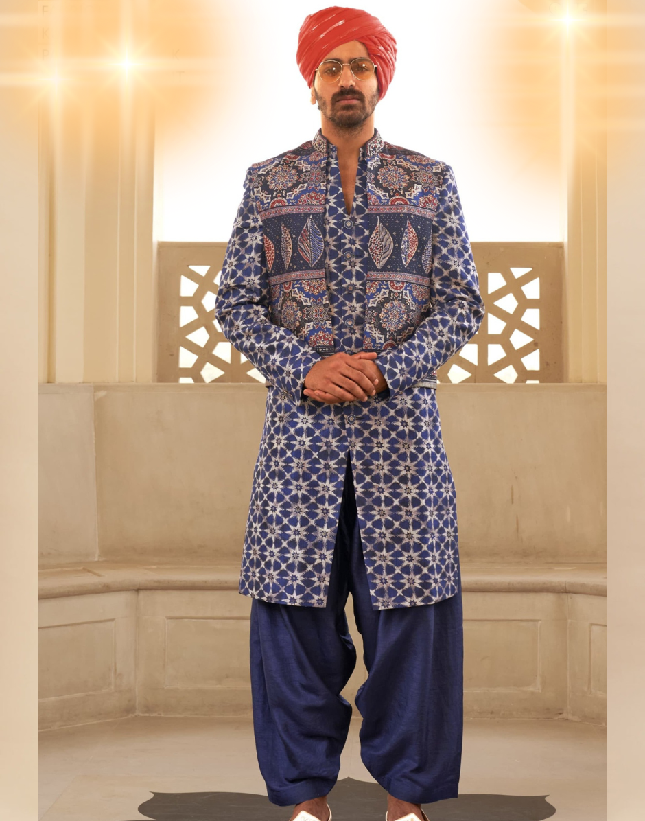 Classy Navy Foil Print Kurta Pyjama for Men Premium Art Silk Ethnic Set - Buy