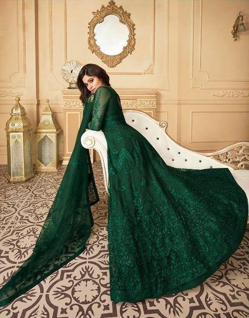 Dark Green Embroidered Anarkali Suit with Net Dupatta for Rent - Glamourental