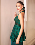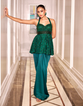 Designer Green Halter Neck Peplum Kurta with Hand Embellishments & Draped Skirt Perfect for Modern Celebrations