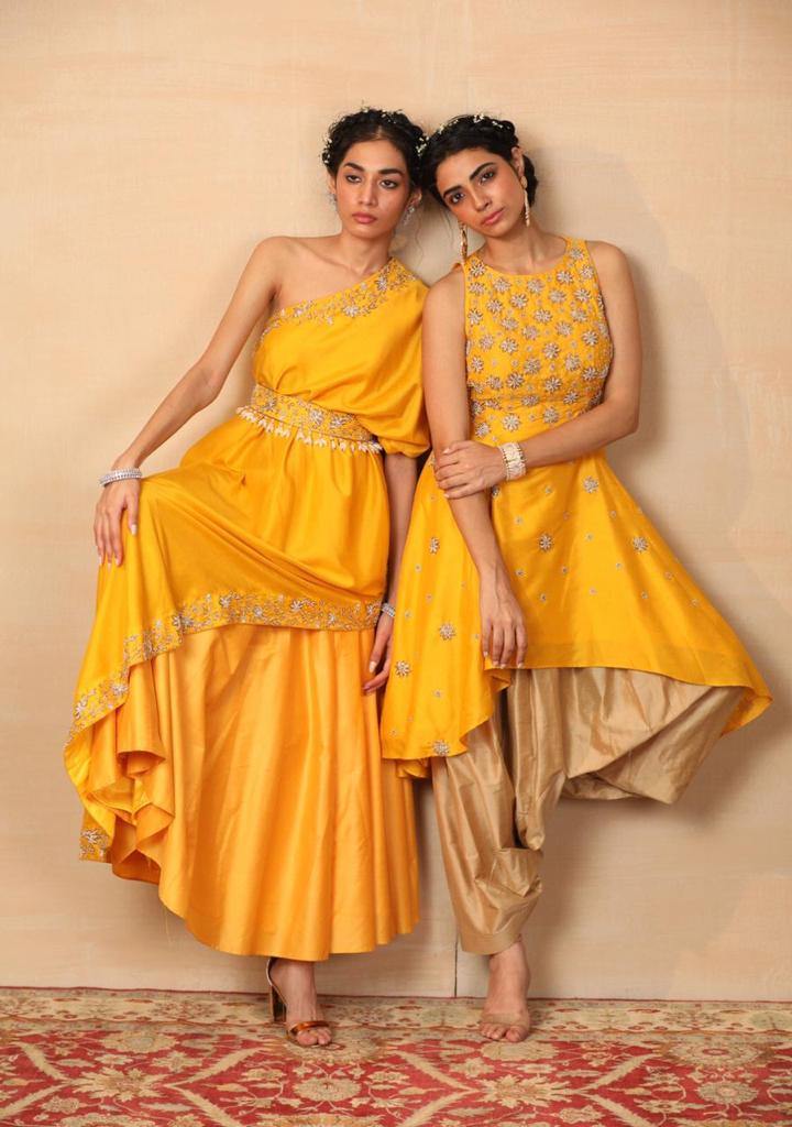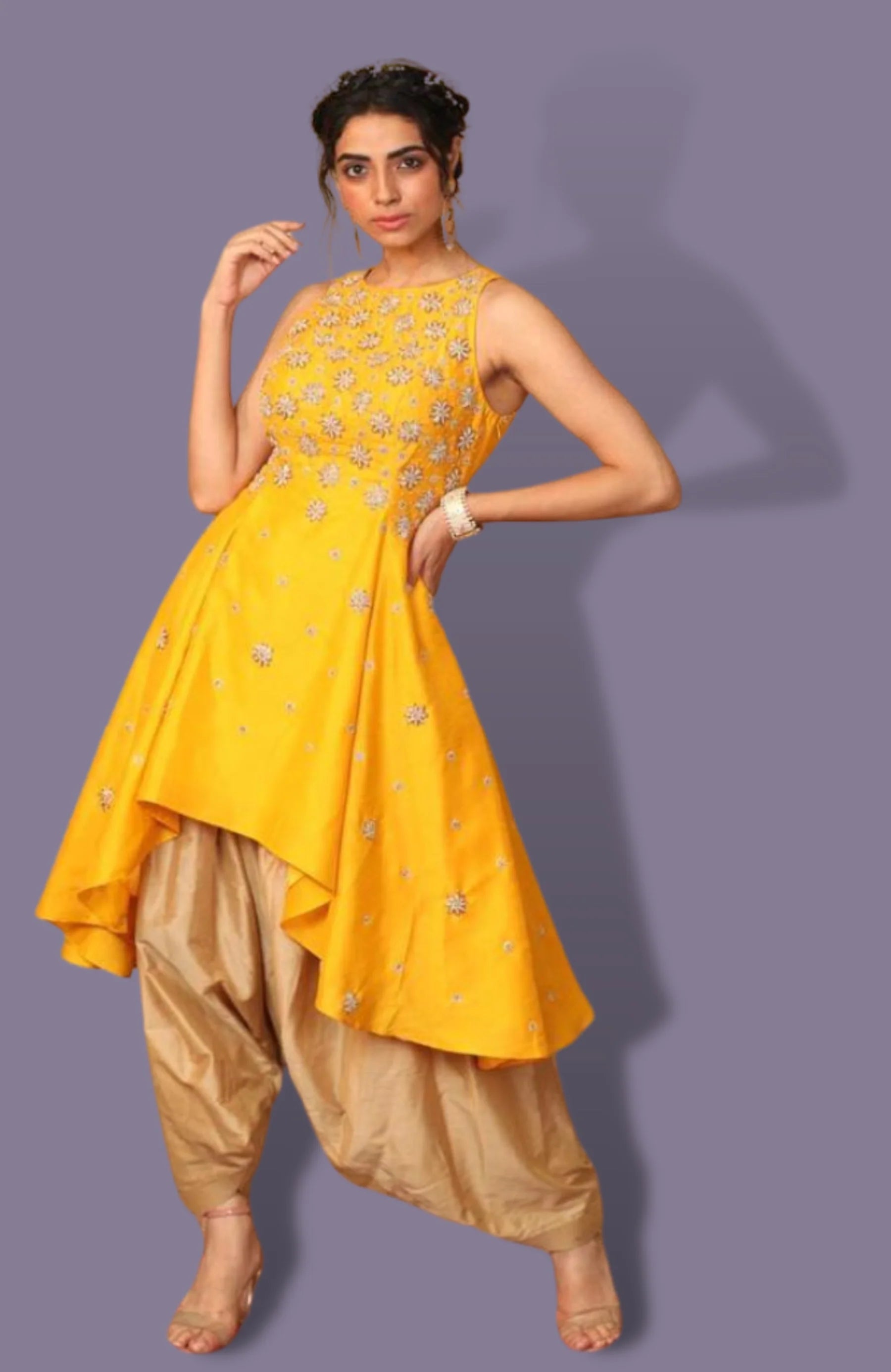Bright Mustard silk kurta with dhoti is a perfect pair to wear at the sangeet ceremony. Kurta with Shantoon lining is paired with hand-embroidered Nakshi kurta that is embellished with Resham, pearls and Zardosi – making it an ideal kurta design for women.