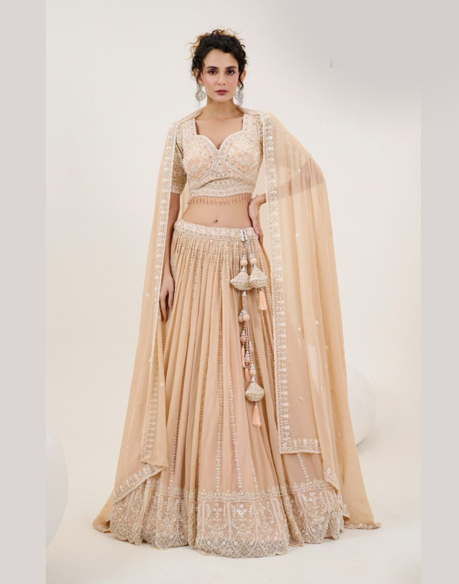 Elegant Beige Lehenga Set Georgette Jacquard with Embroidered Blouse & Handwork Dupatta