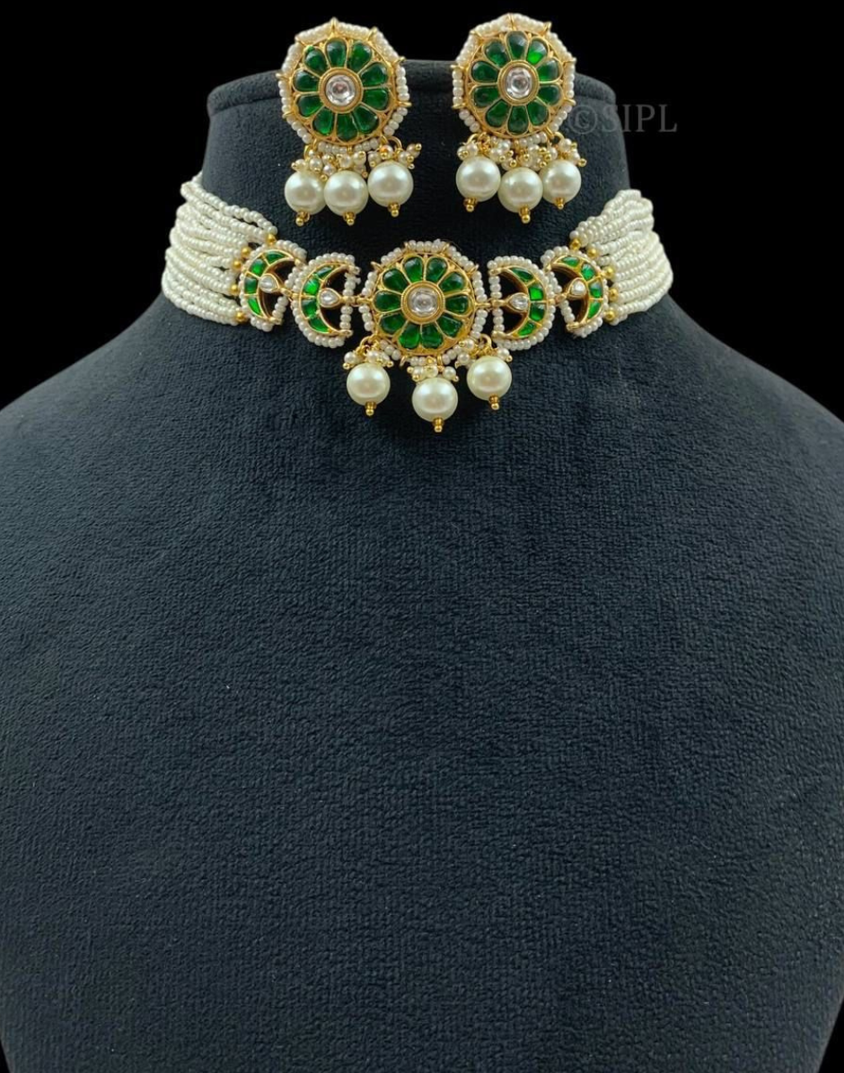 Elegant Green Kundan Pearl Choker Necklace Set with Earrings Traditional Indian Jewelry