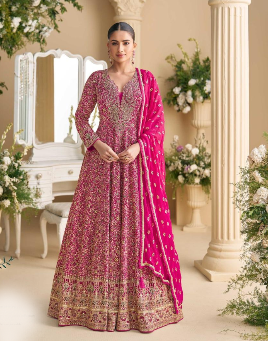 Festive Pink Georgette Gown with Intricate Swarovski & Zarkan Embroidery Dupatta Included - Buy