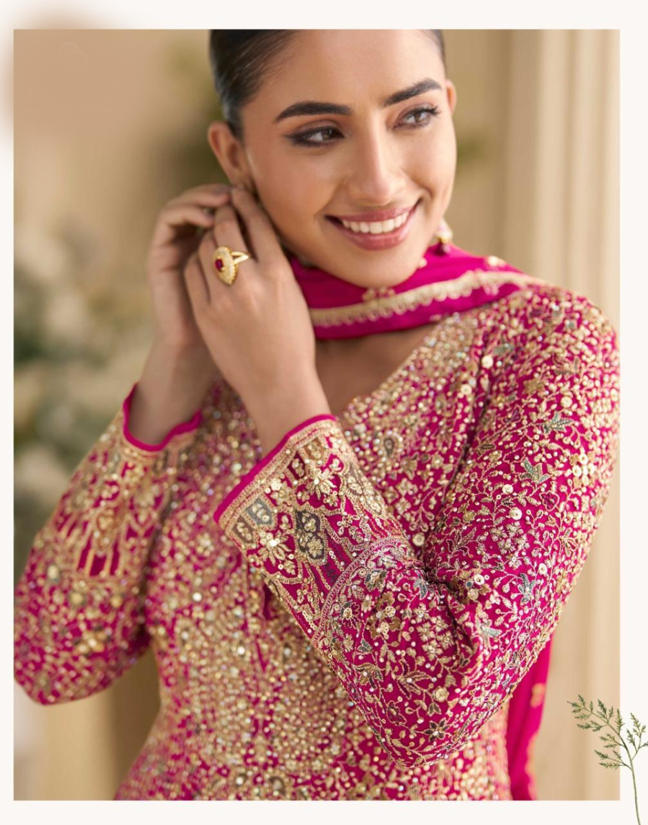 Elevate your festive wardrobe with this elegant pink georgette gown, designed for both comfort and style. Featuring intricate Swarovski and Zarkan embroidery, the ensemble is completed with a matching dupatta that adds a refined touch. Perfect for special occasions, it combines delicate craftsmanship with luxurious fabric to ensure a graceful and sophisticated look.