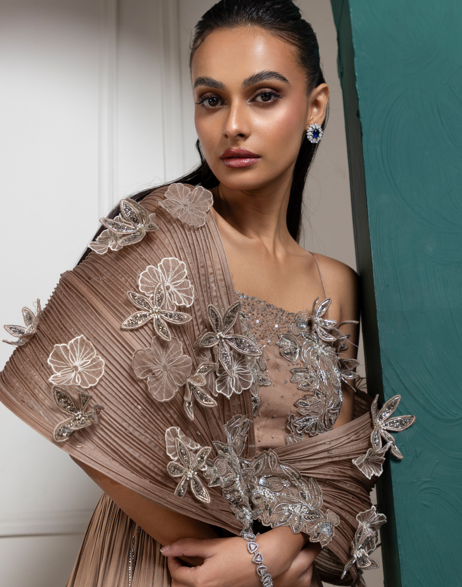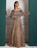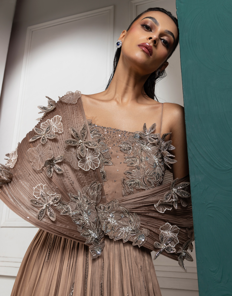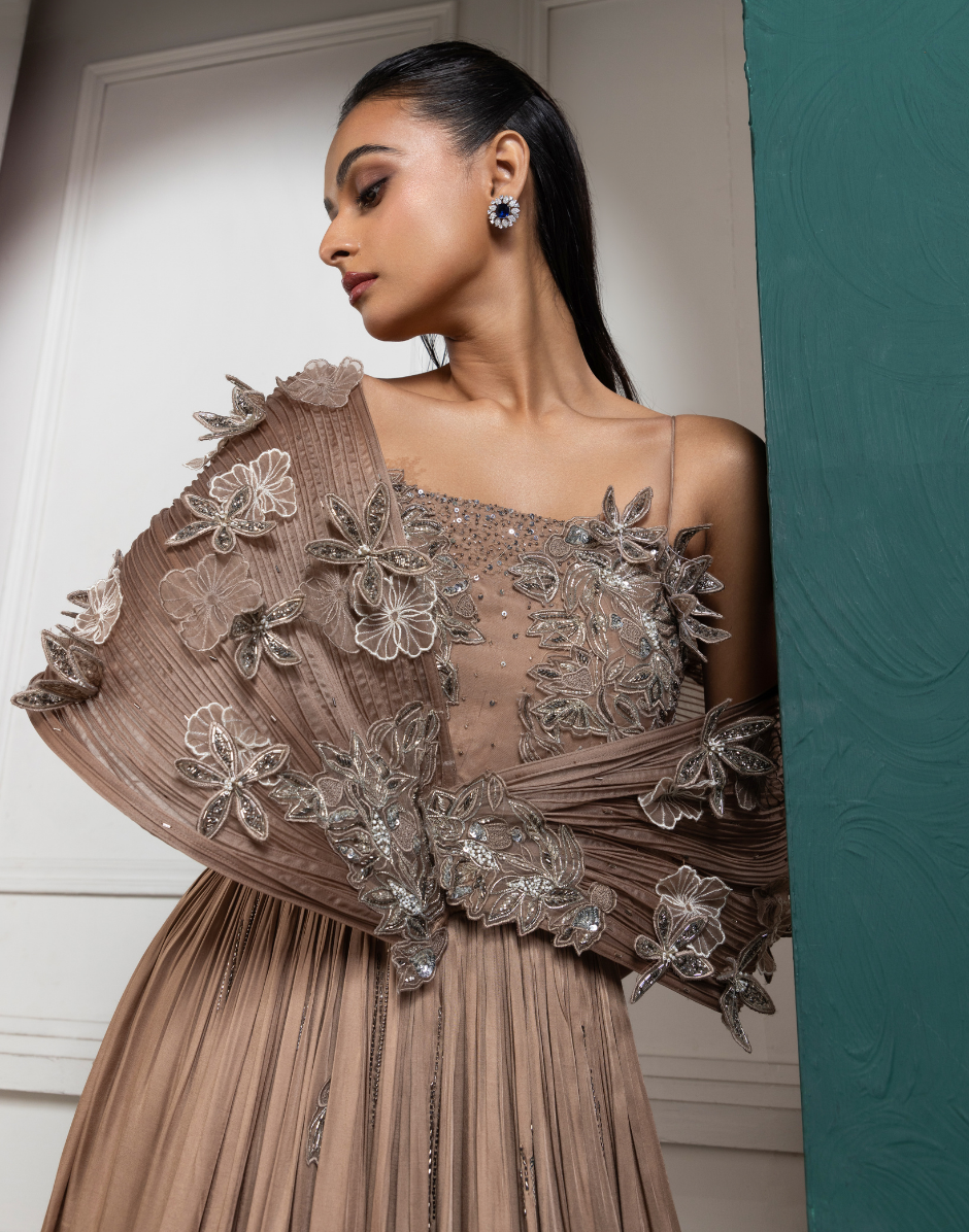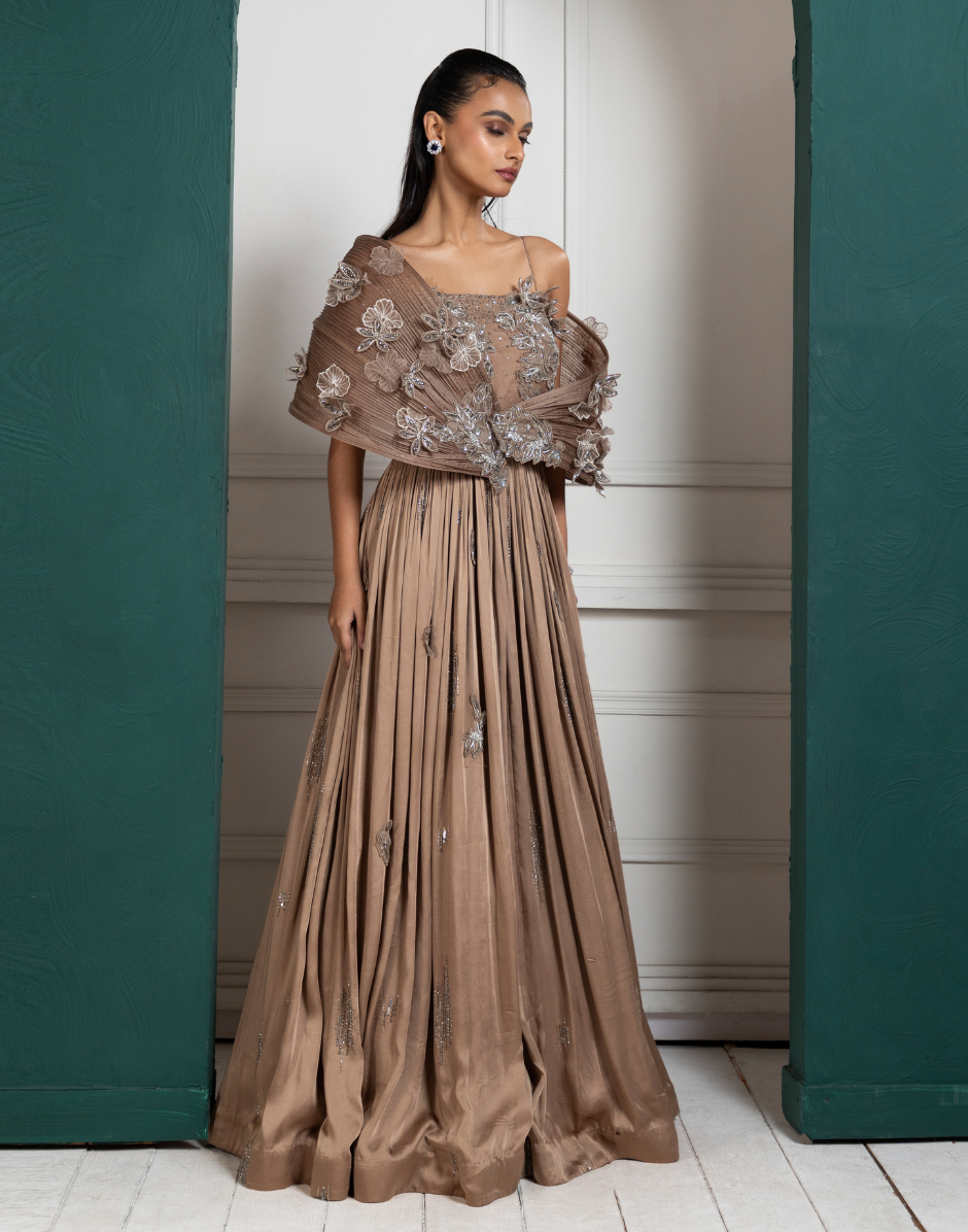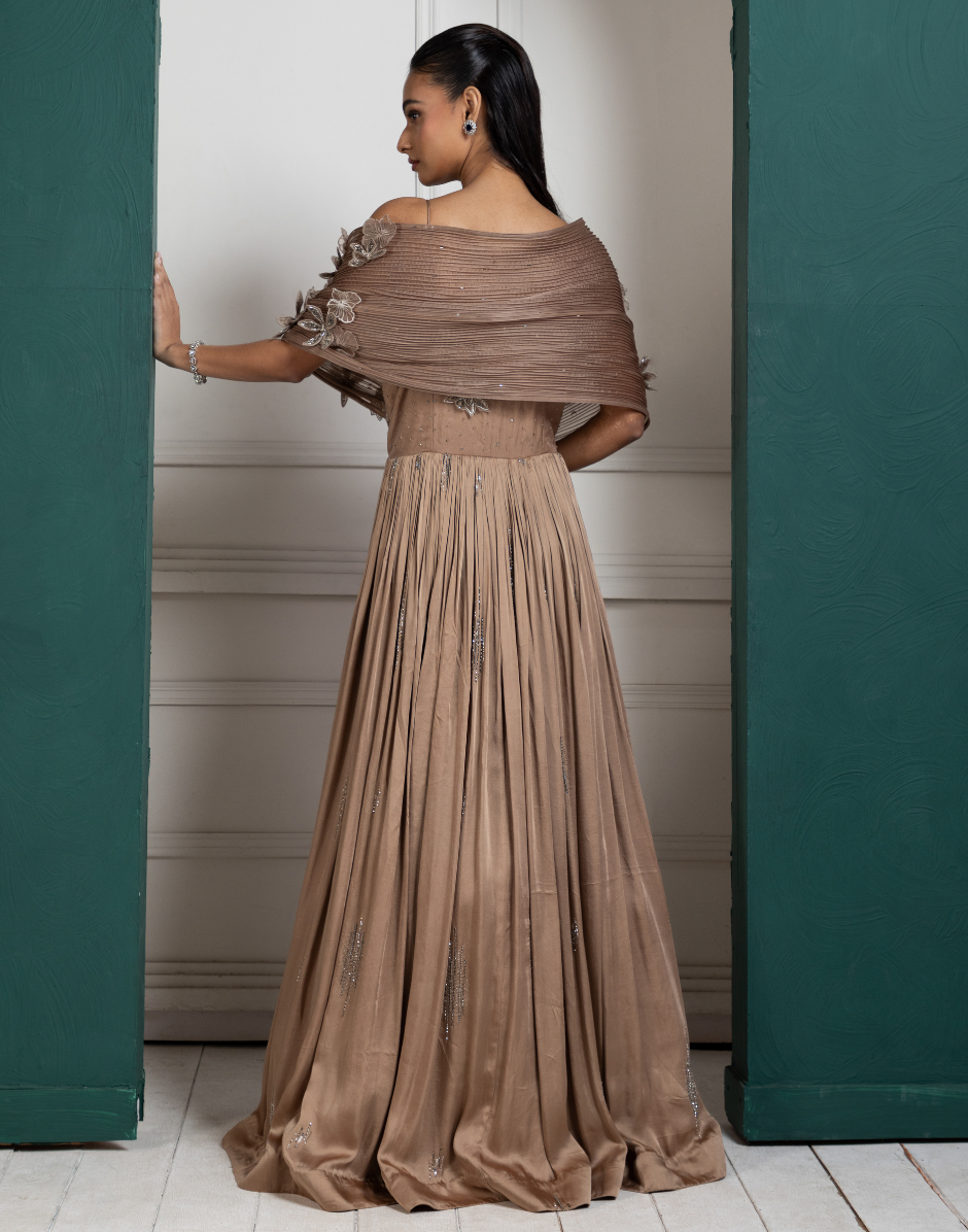 A stunning gold-toned gown featuring a lavish blend of intricate embroidery and flowing textures. The bodice is adorned with detailed floral handwork, complete with shimmering crystals, beads, and sequin embellishments. The off-shoulder draped detailing gracefully falls over the arms, creating a soft and ethereal effect. The waistline flows into a pleated skirt with subtle embroidery accents, adding sophistication and volume to the silhouette. This gown is perfect for evening events, receptions, or cocktail parties, offering a timeless and luxurious look.