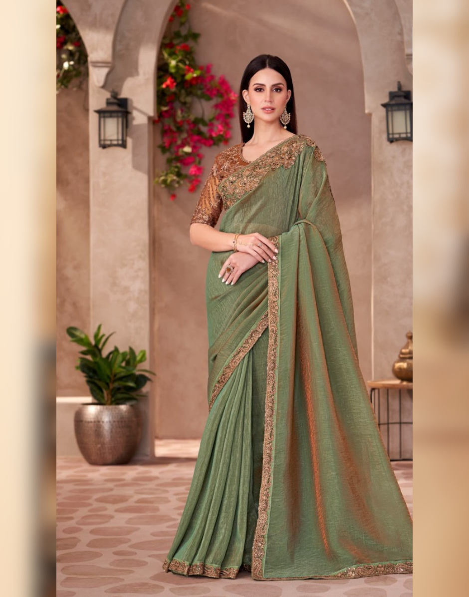Golden Shine Mehendi Green Saree in Georgette with Elegant Linen Blouse - Buy