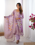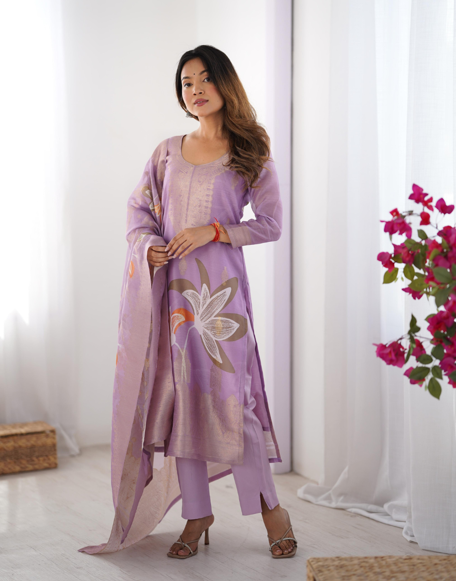 Graceful Purple Chanderi Silk Outfit with Jacquard Detailing & Floral Design