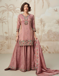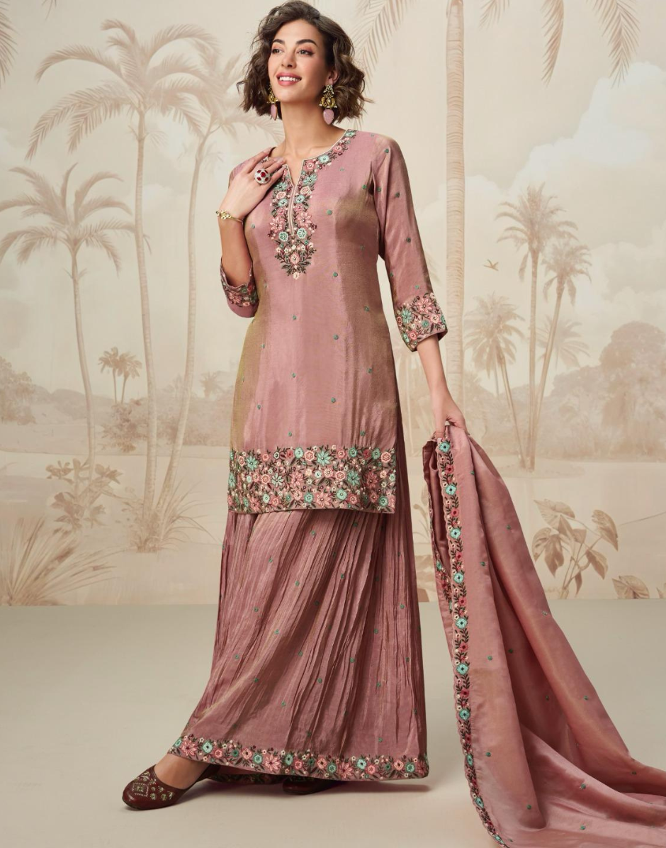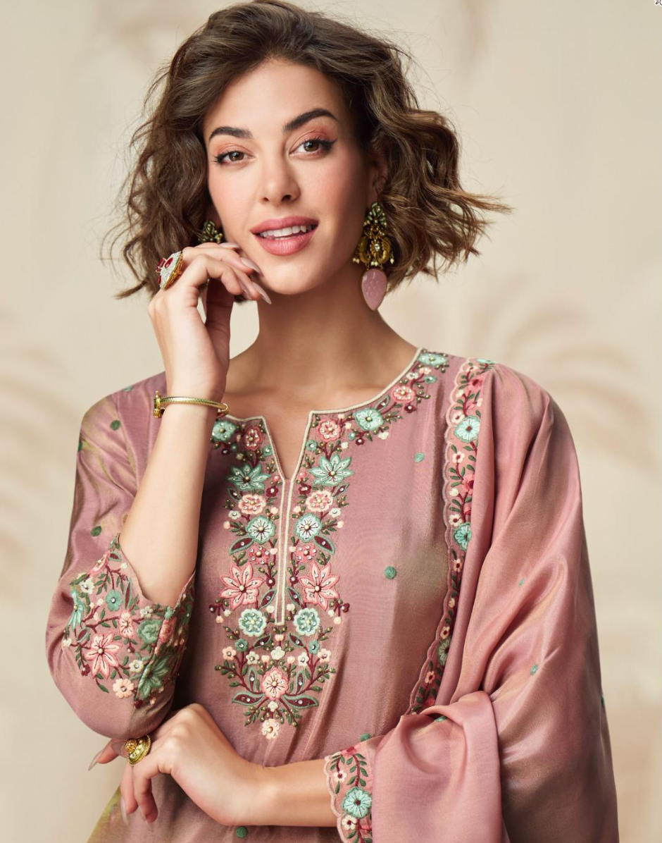 Graceful Rose Pink Floral Embroidered Organza Shimmer Silk Suit Top, Bottom & Dupatta Set