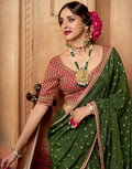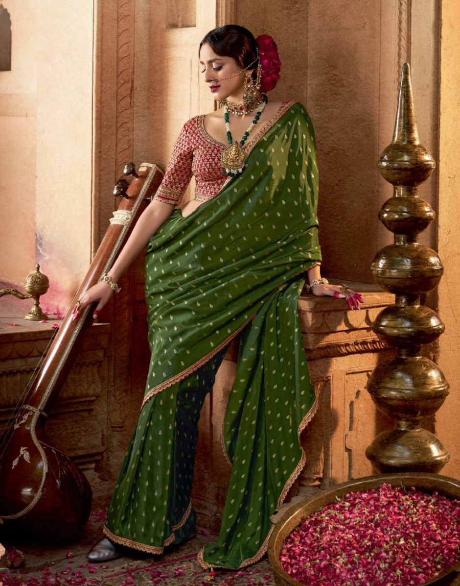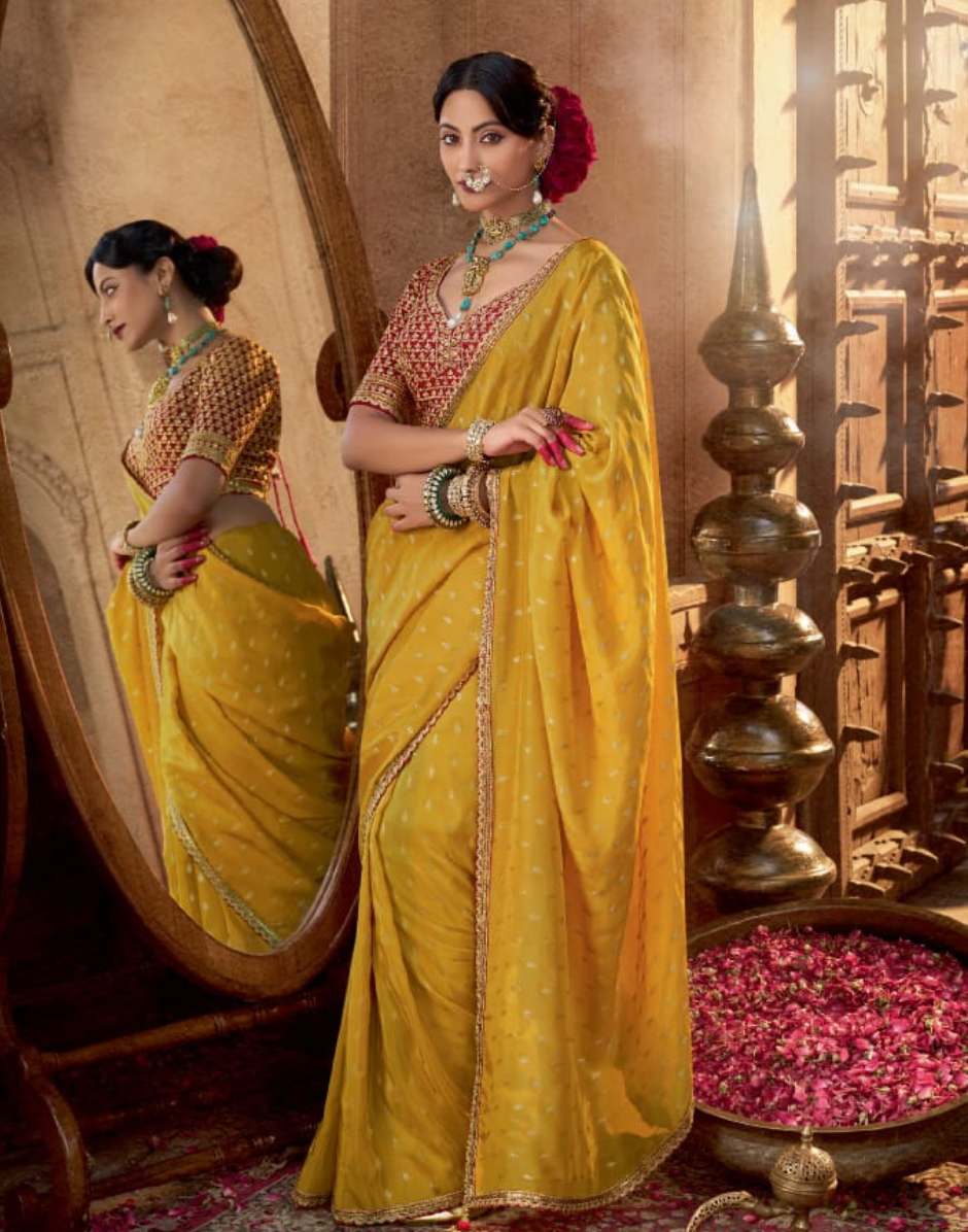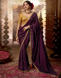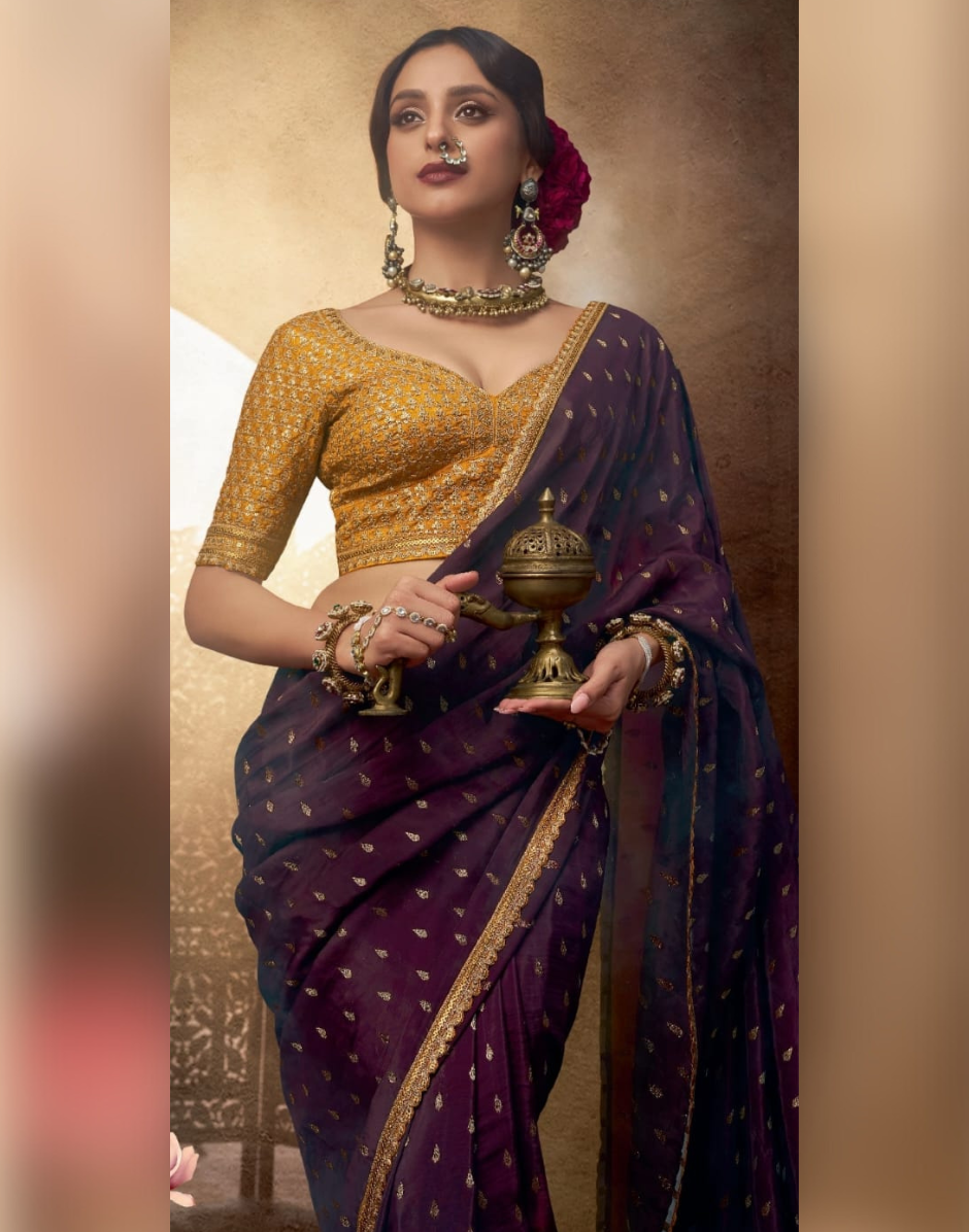 This graceful wine viscose crepe saree showcases exquisite hand dyeing and delicate butti work, enhanced by elegant fancy lace detailing. Complemented by a meticulously embroidered designer blouse, the ensemble reflects refined craftsmanship and sophisticated style. The lightweight viscose crepe fabric offers a comfortable fit and fluid drape, perfect for formal occasions and celebrations.