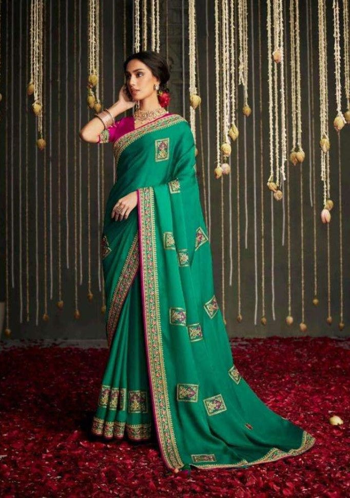 Showcasing a green color silk saree in all over zari embroidered enhanced by distinctive woven border and pallu design in floral motifs beautified. Also comes with a pink color silk embellished blouse in zari and resham embroidery.Â