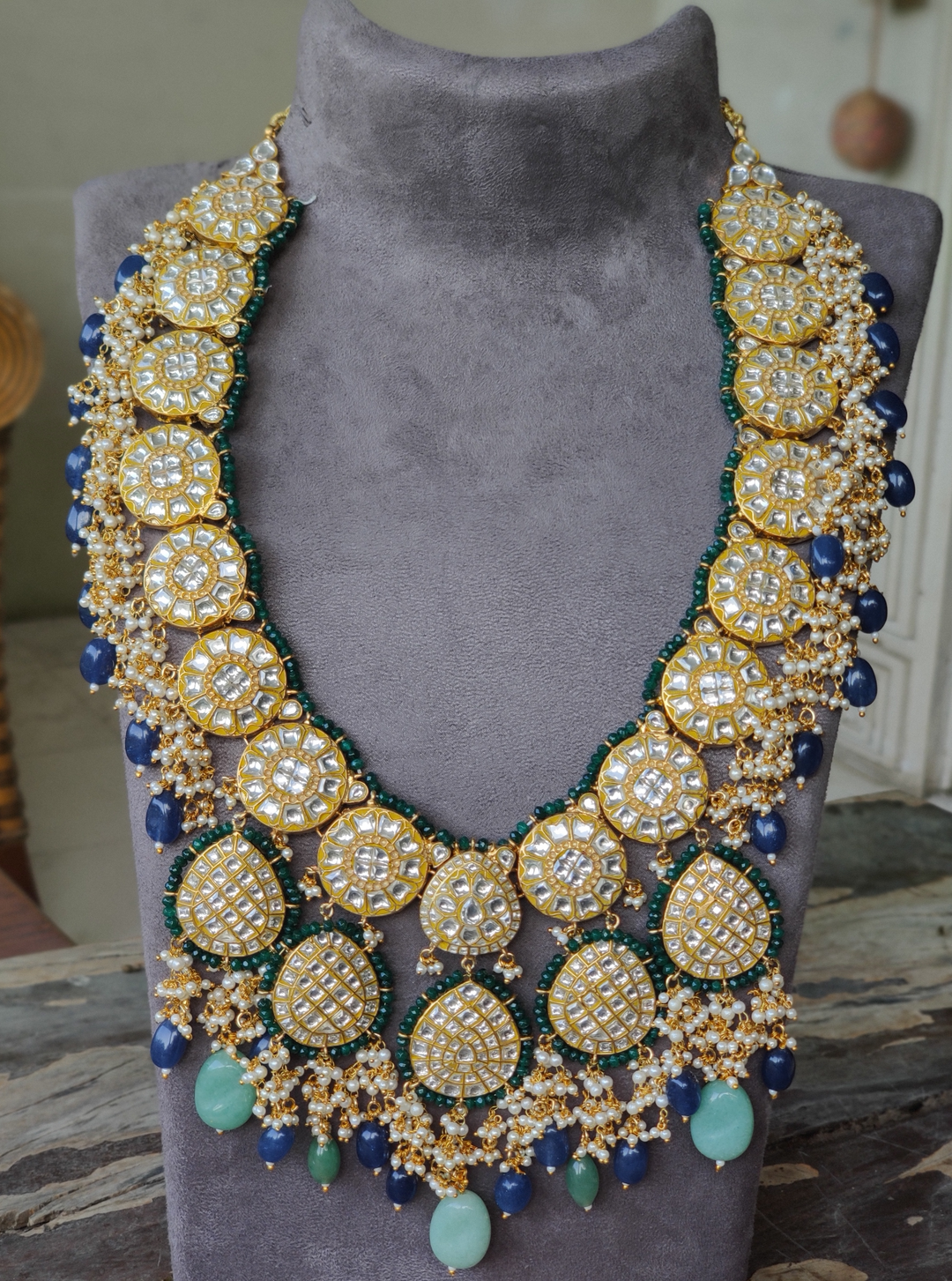 Long Necklace In Blue And Green Beads Loaded With Pearls