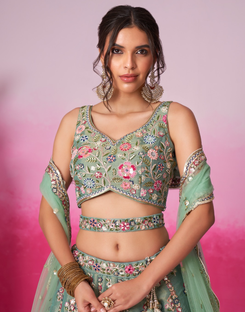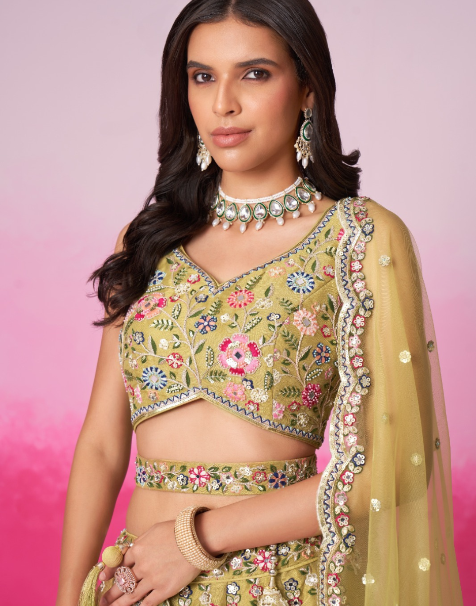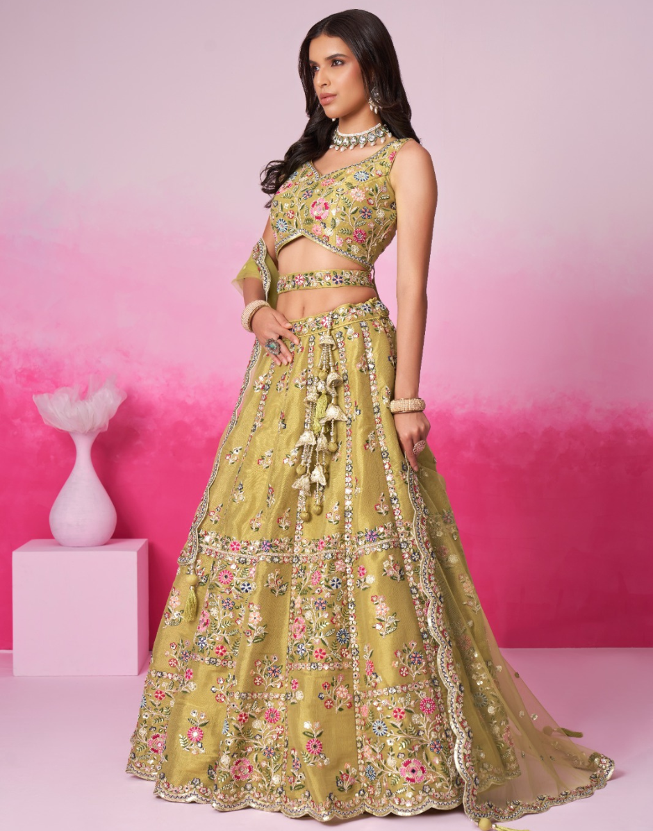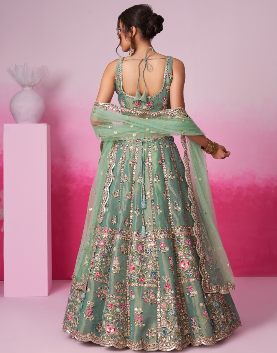 Luxury Designer Lehenga Set in Net with Heavy Embroidery Moti, Sequins, Mirrors & Signature Tassels