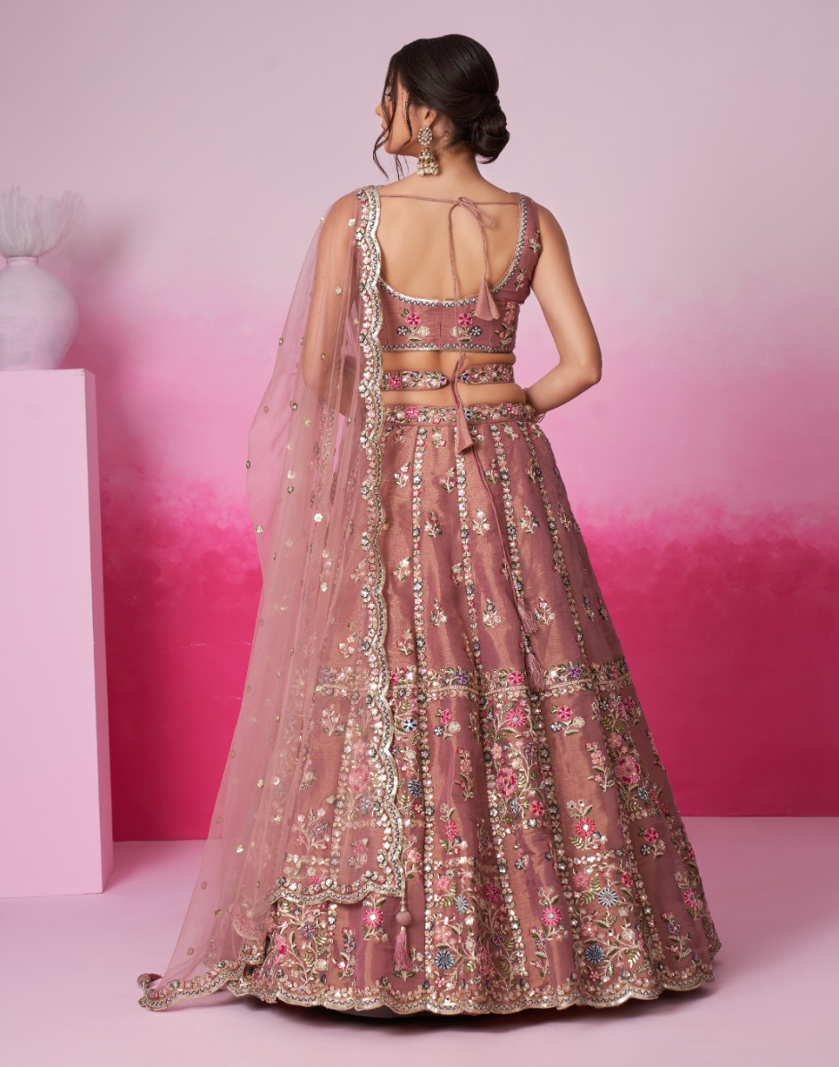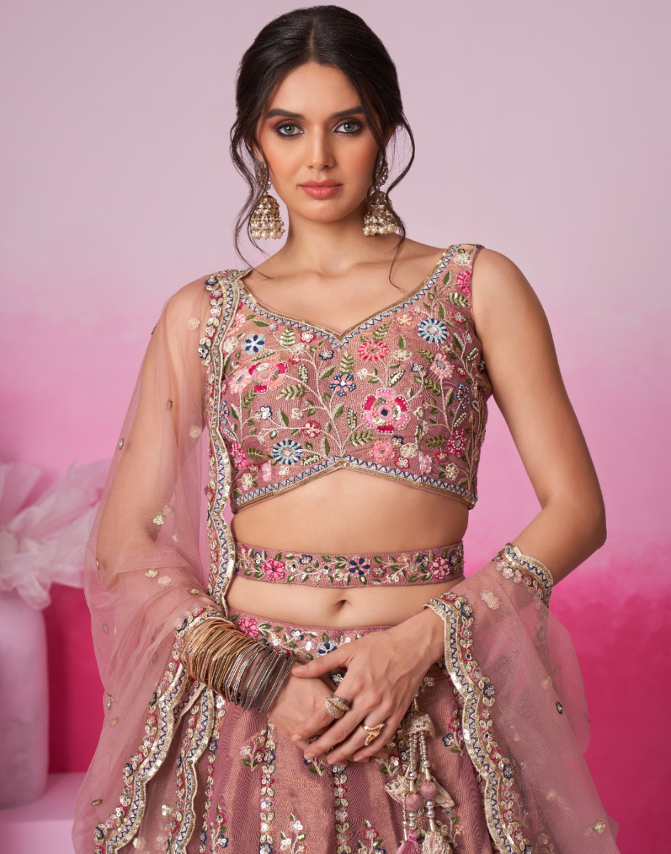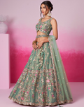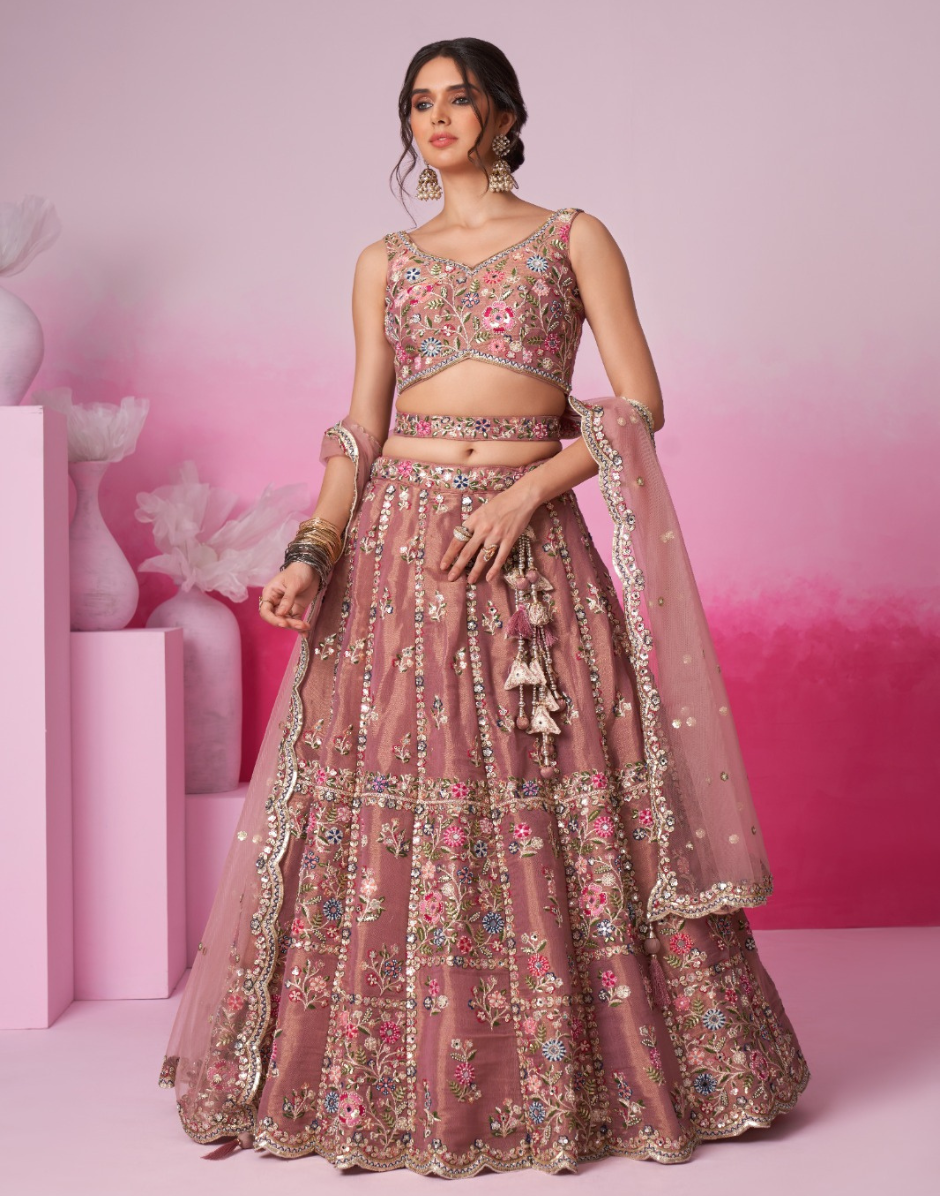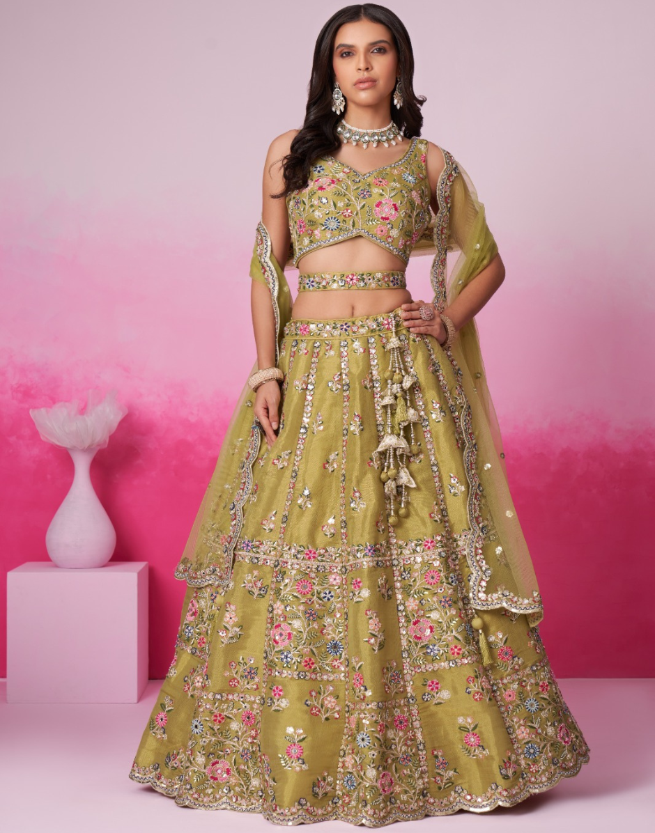 Luxury Designer Lehenga Set in Net with Heavy Embroidery Moti, Sequins, Mirrors & Signature Tassels