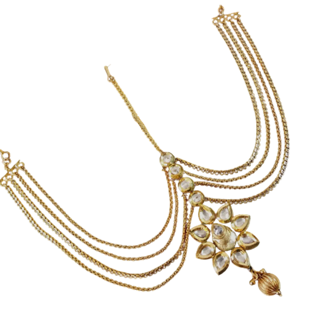This A Simple And Stylish Maang Tika That Will Add A Dashing Quality To Your Entire Look. It Has A Floral Design With Kundan Work And Gold Chains Placced Around It. This Will Compliment Many Looks Perfectly. Product Detail- Maang Tika With Golden Chains, Golden,