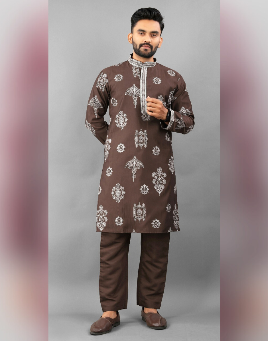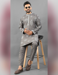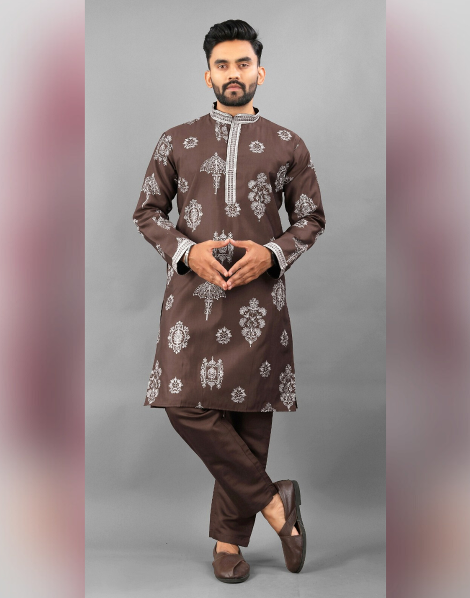 Elevate your traditional wardrobe with this Men’s Ethnic Kurta Pyjama crafted from premium printed art silk. The ensemble features intricate embroidery that adds refined elegance, making it perfect for festive and formal occasions. The breathable fabric ensures comfort, while the tailored fit enhances your silhouette. Ideal for cultural celebrations or special events, this kurta pyjama combines classic style with contemporary detailing for a distinguished look.