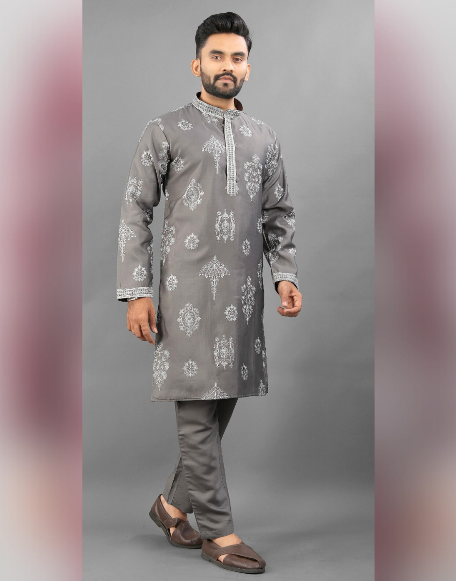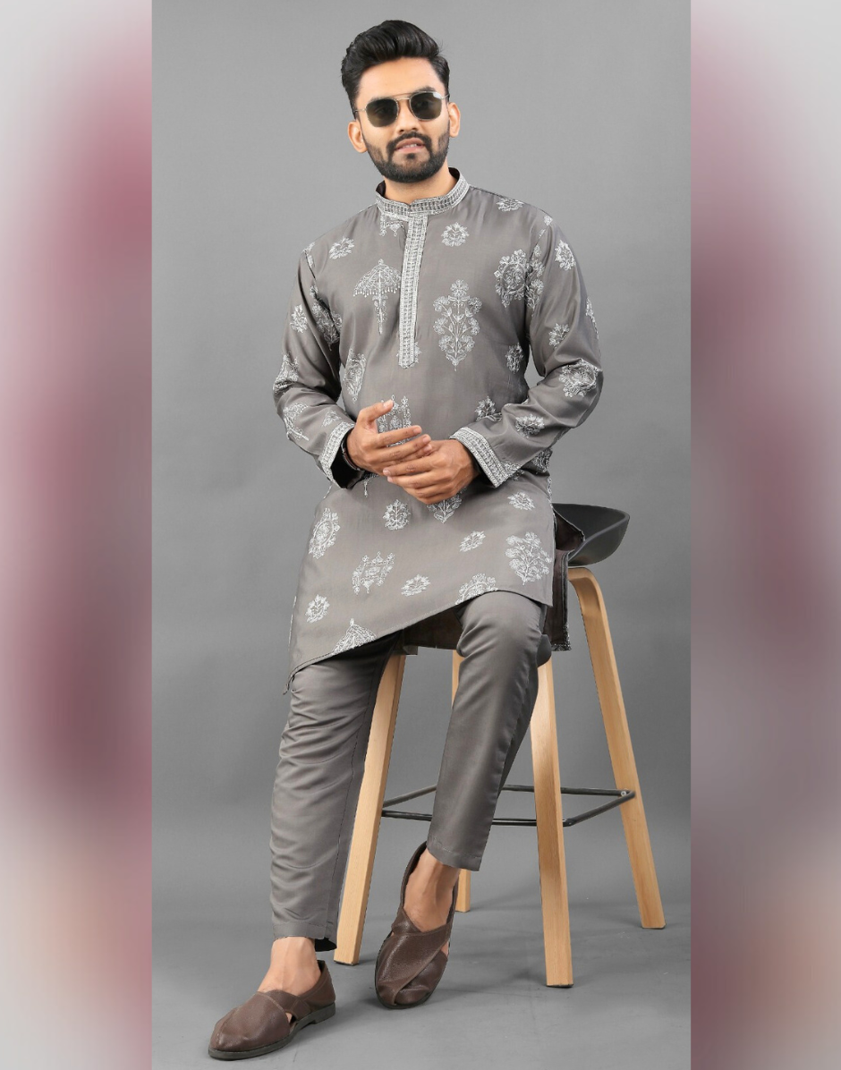Men’s Ethnic Kurta Pyjama in Printed Art Silk with Detailed Embroidery Stylish Occasion Wear - Buy