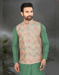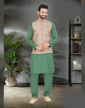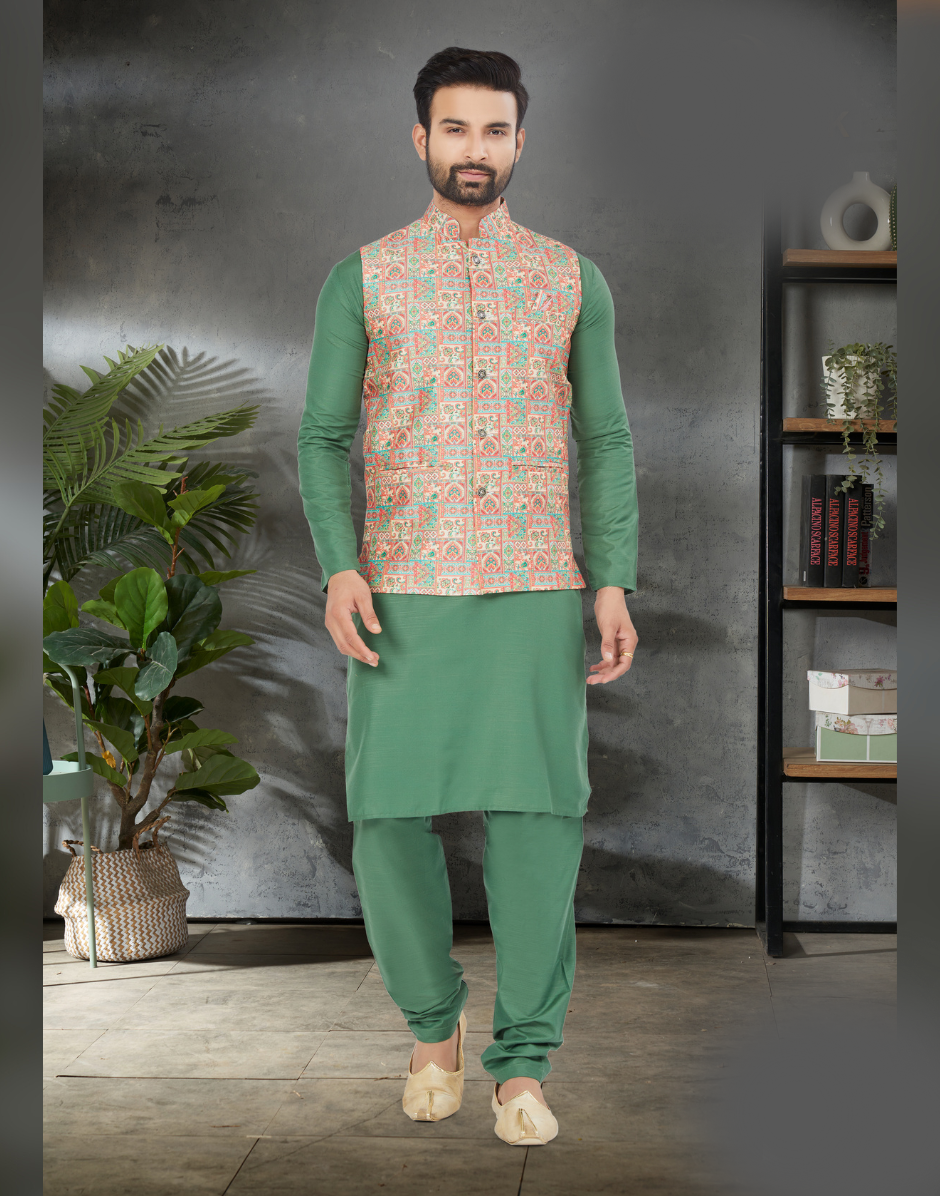 Men’s Green Kurta Pajama with Digital Print & Jacket Perfect for Festive Wear