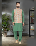 Elevate your festive wardrobe with this men's green kurta pajama set featuring intricate digital prints and a coordinating jacket. Crafted for comfort and style, this ensemble blends traditional design with modern detailing, making it ideal for celebrations and special occasions. The vibrant green hue and detailed print add a refined touch, while the jacket enhances versatility and sophistication. Perfect for those seeking a distinguished yet comfortable festive outfit.