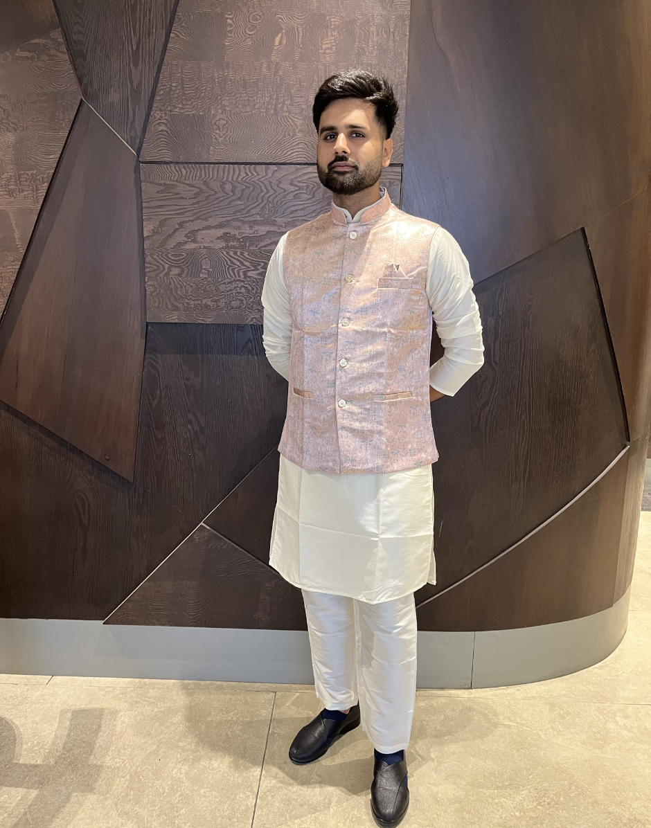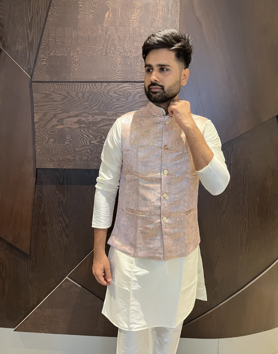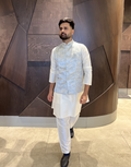 Men’s Kurta Pyjama in Pure Cotton with Intricate Jacquard and Matching Koti - Buy
