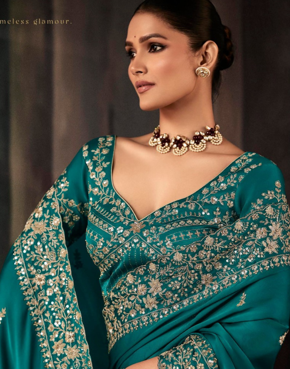 Elevate your ethnic wardrobe with this stunning emerald green saree, a masterpiece of traditional craftsmanship. Adorned with intricate aari embroidery and exquisite handwork detailing, each motif reflects meticulous artistry and cultural heritage. The rich jewel tone complements all skin tones, while the luxurious fabric drapes beautifully for a graceful silhouette. Includes a coordinating blouse piece, ready to wear for weddings, celebrations, or special occasions. Perfect for those who appreciate fine embroidered textiles and timeless elegance.