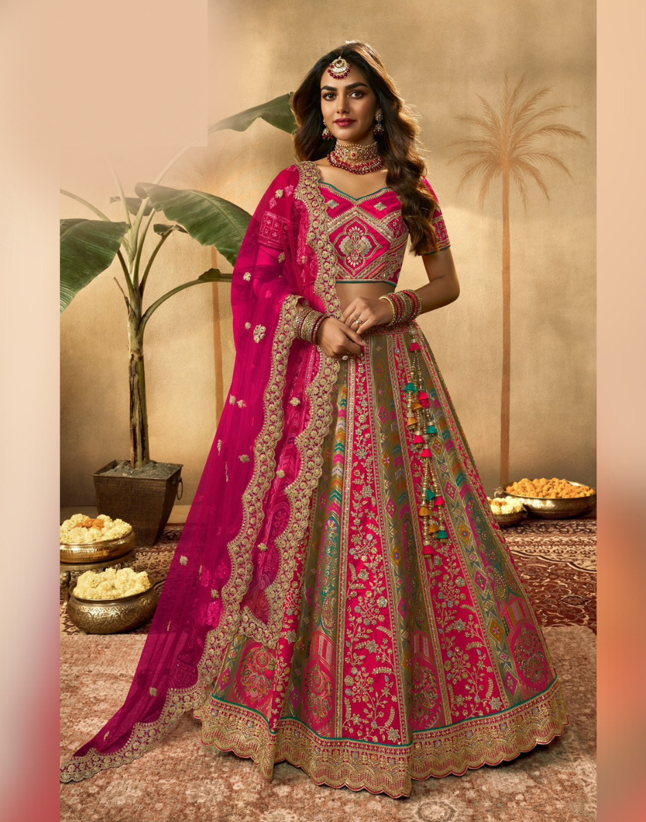 Pink and Green Silk Lehenga for Weddings & Festive Wear Sequin Zarkan Work with Belt & Latkan - Buy