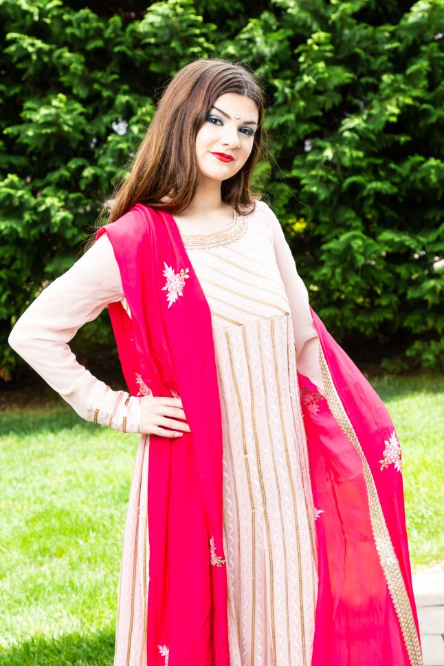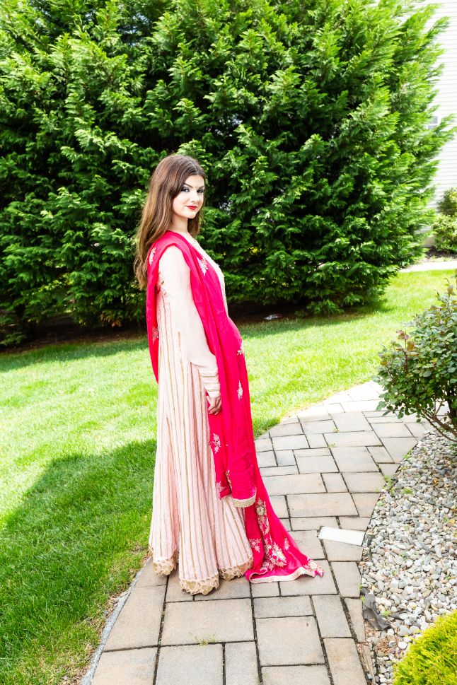 This pink Anarkali is embroidered with beautiful geometric patterns. It is made of a light and airy fabric, perfect for warm days or special occasions.