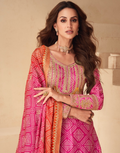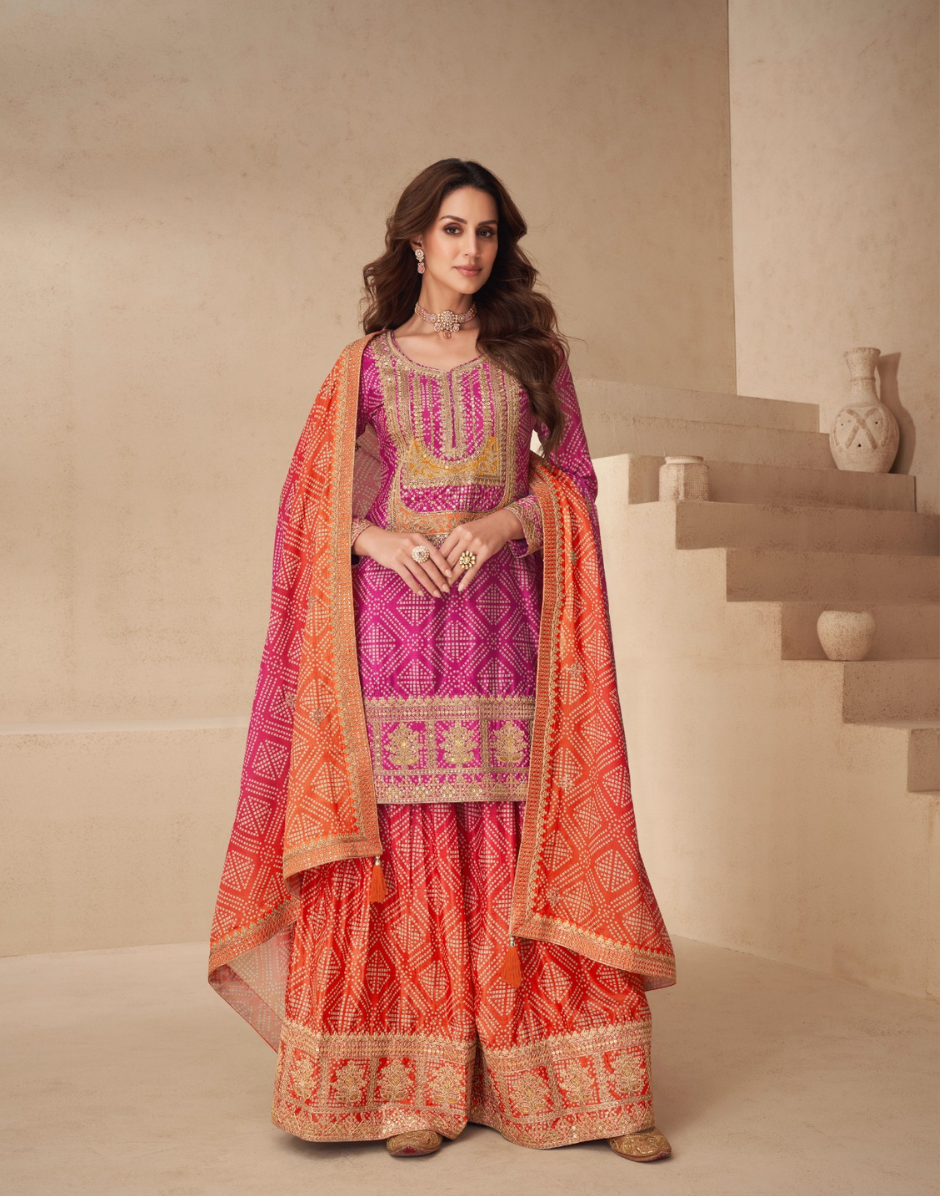 Premium Chinnon Silk Palazzo Suit in Orange & Pink Embroidery & Embellished - Buy
