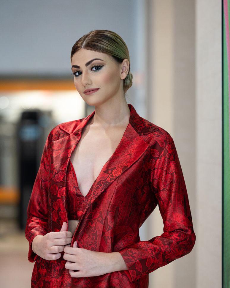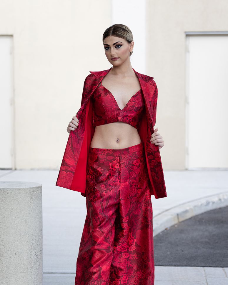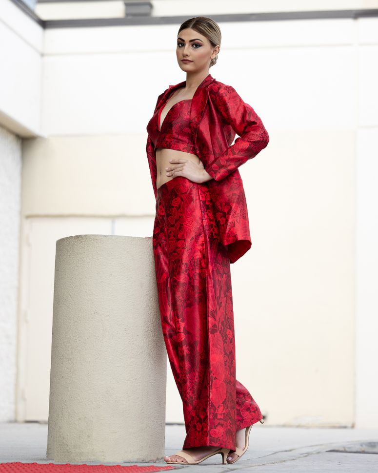 Red Satin Jungle Print Blazer And Pant Set - Rent