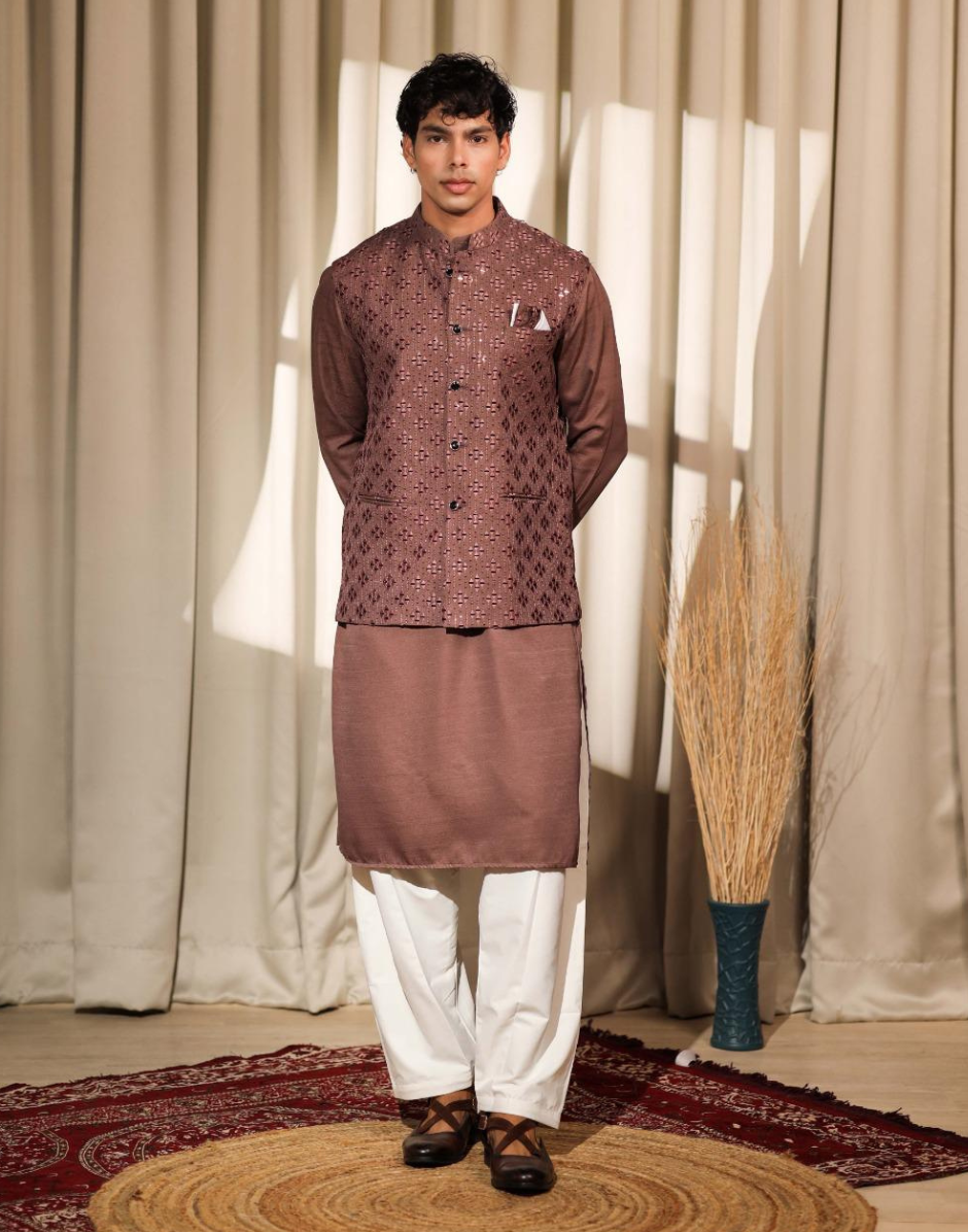 Experience timeless elegance with this brown kurta pyjama crafted from a premium silk blend. Featuring rich embroidery, it embodies regal traditional wear designed to impress at formal gatherings and cultural events. The meticulous detailing enhances the luxurious fabric, offering both comfort and a distinguished look for men who appreciate heritage with sophistication.