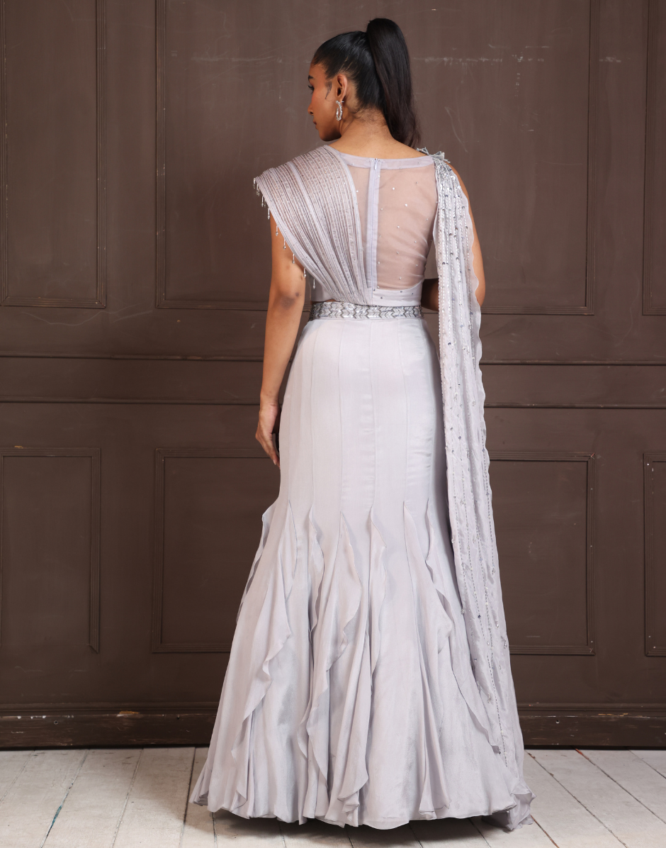 Radiate sophistication in this stunning Silver Petal Embellished Lehenga Set. The crop top features intricate 3D floral appliqué work, adding depth and elegance to the outfit. Complemented by a single shoulder draped detail, it creates a modern twist on a classic silhouette. The high-waisted flared lehenga, with its cascading ruffles and graceful flow, enhances the charm of this ensemble. Perfect for weddings, receptions, or high-end evening events, this outfit is designed to make a statement. Pair with sparkling accessories and a sleek hairstyle to complete the look.