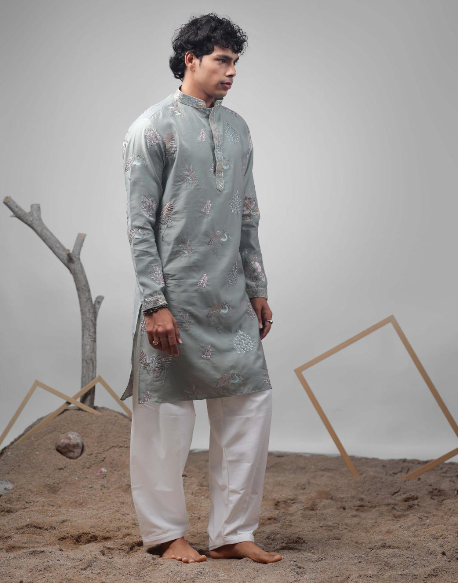 Sophisticated Grey Silk Blend Kurta Pyjama Set with Embroidery Traditional Meets Modern - Buy