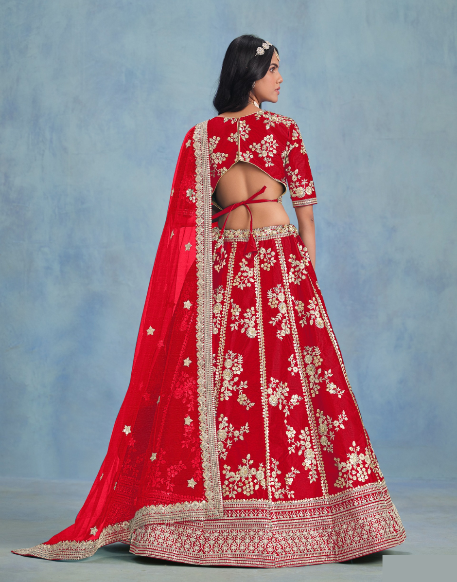 Elevate your ethnic wardrobe with this exquisite Traditional Embroidered Lehenga Choli. Crafted from premium art silk, the ensemble features intricate embroidery work that showcases exceptional craftsmanship. The lehenga and choli combination is complemented by a graceful net dupatta that adds an ethereal quality to this classic silhouette, perfect for weddings, festivals, and special ceremonies.